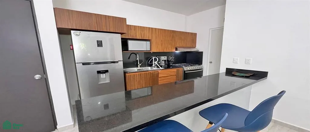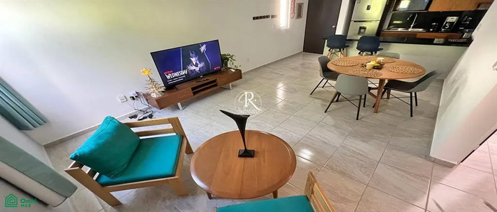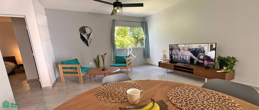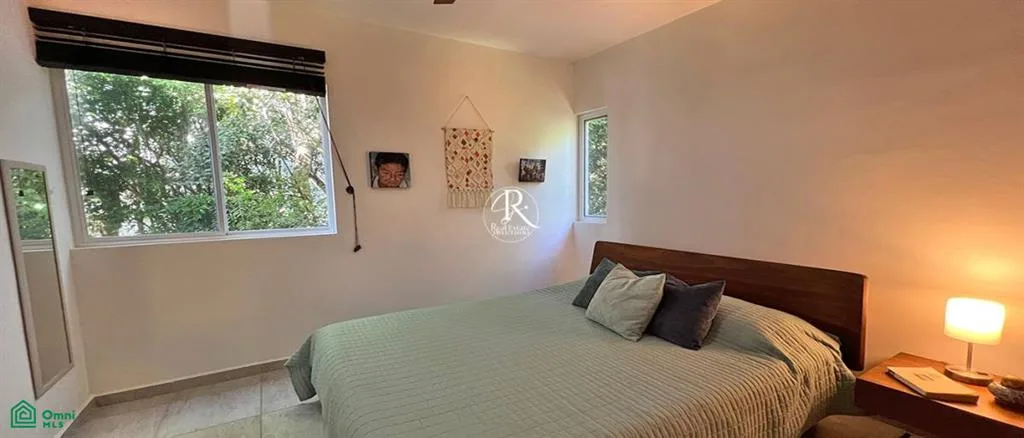 This condo presents a tranquil living space in the Caribbean beach town of Puerto Morelos. It is situated within the gated community of Selva Escondida, approximately a 10-minute drive from the beach.