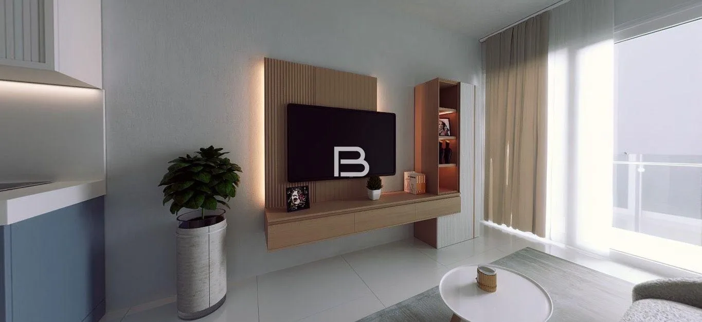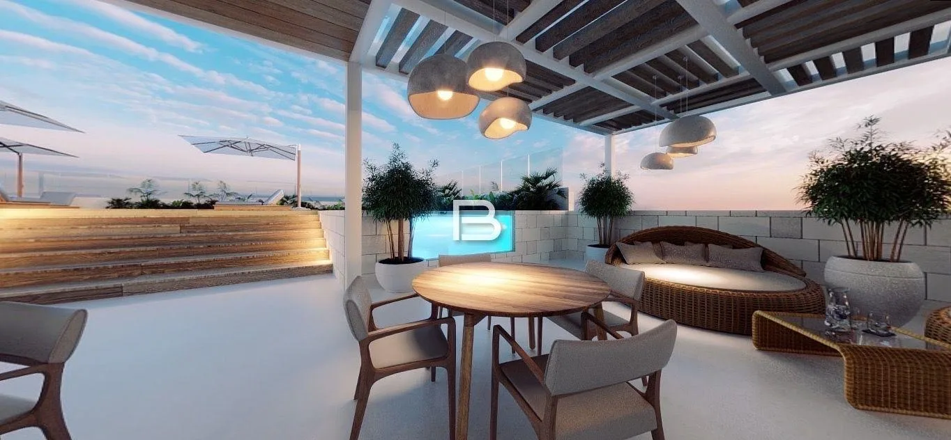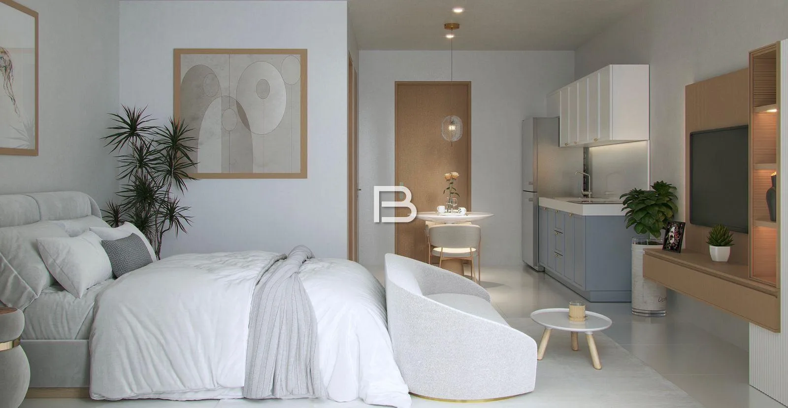 Residents have access to a rooftop sun deck with sea views, a jacuzzi, a swimming pool, a gym, a kids' club, a co-working space, 24/7 security, and a lobby.