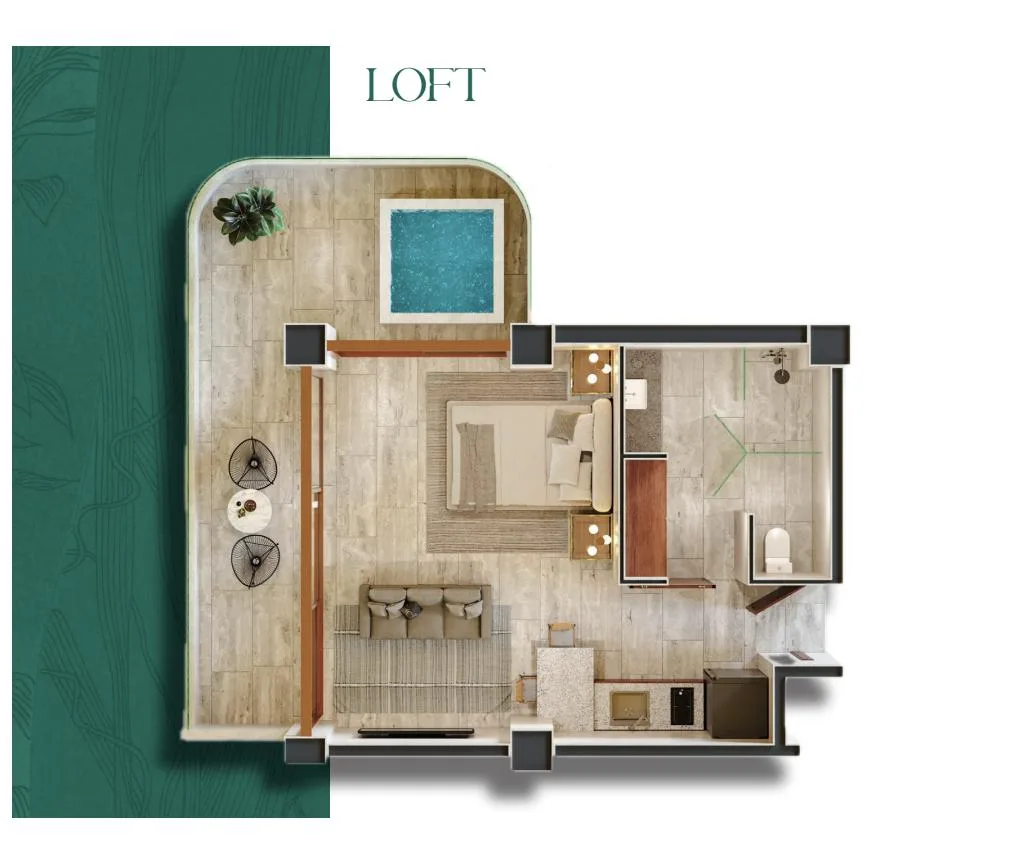 The loft-style layout includes an open bedroom, living room, kitchen, breakfast bar, and bathroom. It features a private terrace with a pool and offers views of the mangrove. The unit is furnished and equipped, with a capacity for up to four people. Hotel service is available 24 hours a day.
