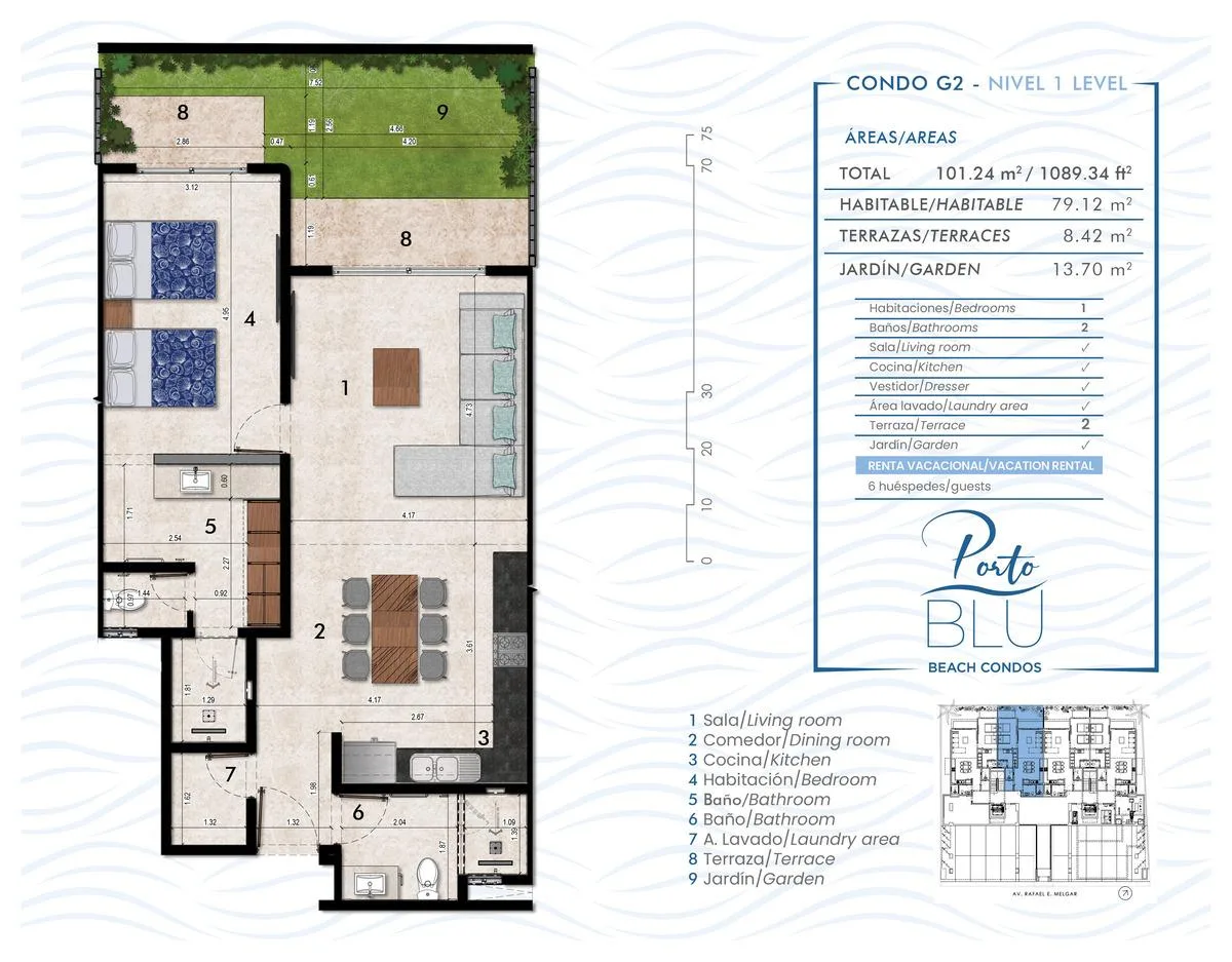 Apartment 103 has a total area of 101. 24 square meters. The livable area is 79. 12 square meters, complemented by an 8. 42 square meter terrace and a 13. 70 square meter garden.