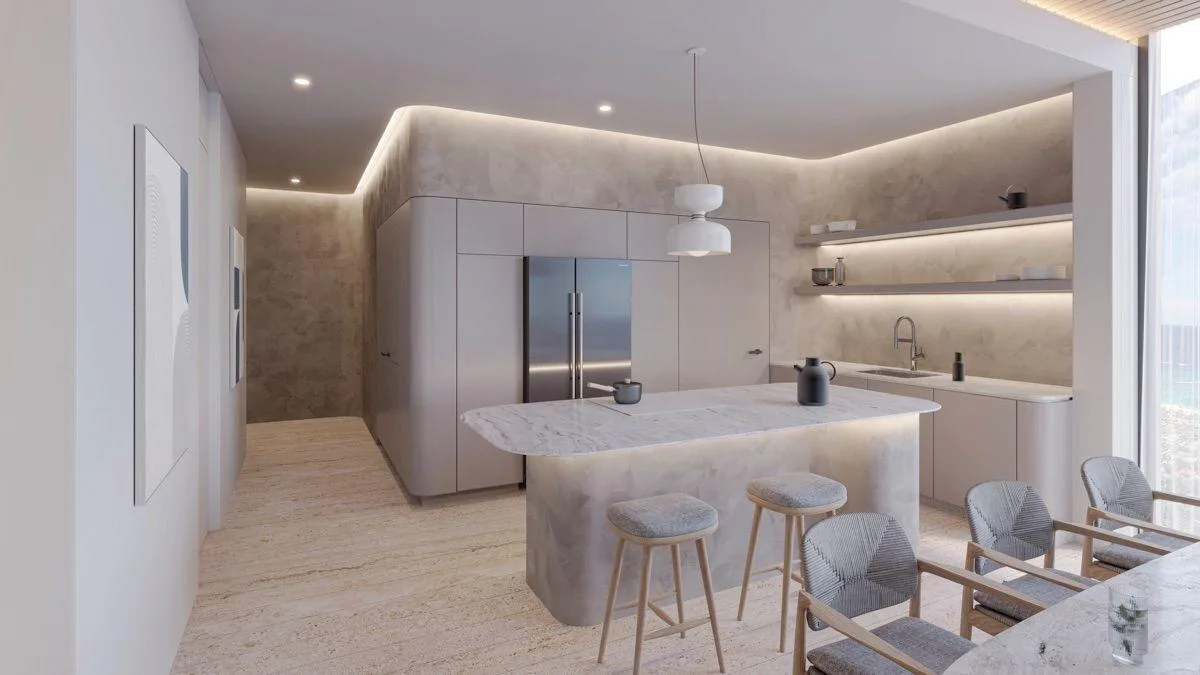 The condominiums range in size from studios to large four-bedroom units with different layouts. All apartments feature a spacious open-concept design with floor-to-ceiling windows that allow abundant natural light, and some units offer ocean views. Each home includes a fully equipped kitchen with an island and premium appliances, a sun-filled living and dining area, and a private covered terrace equipped with a jacuzzi.