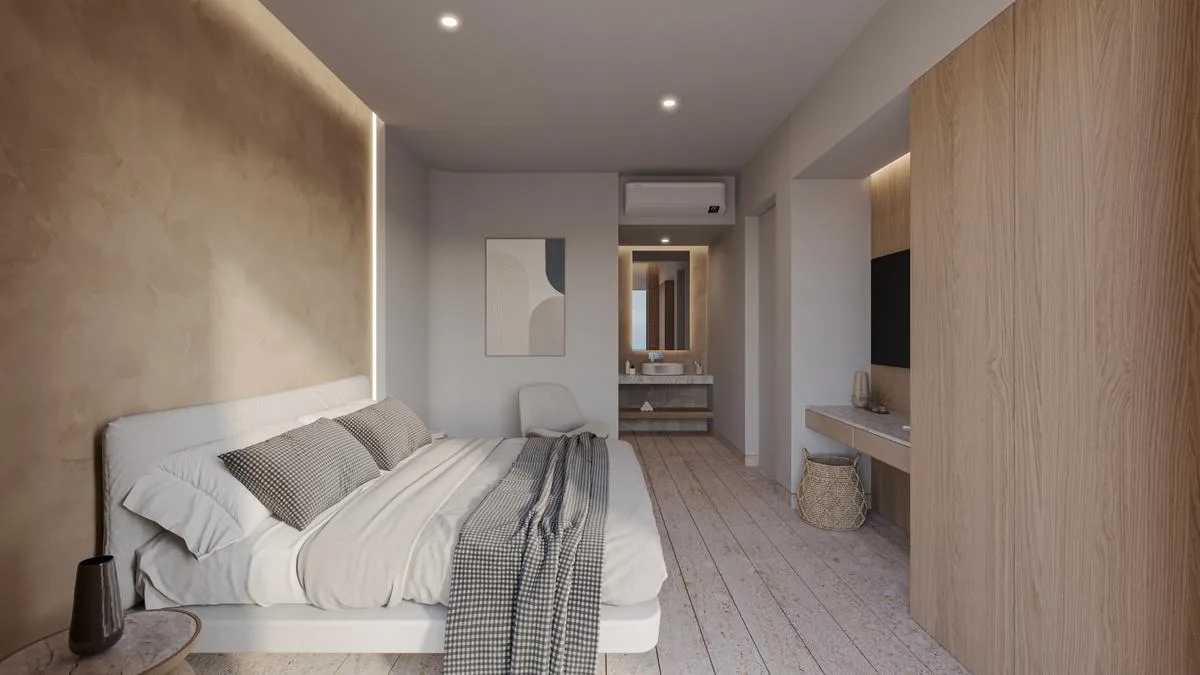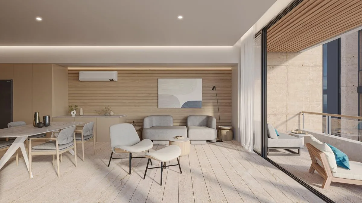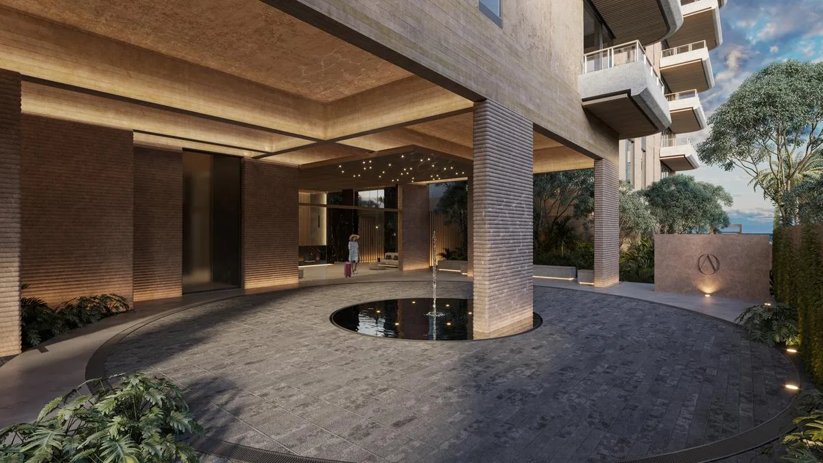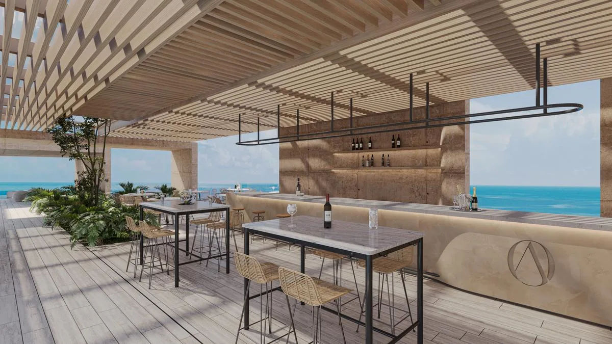 Resident amenities encompass a private beach club with sunbeds and palapas, an infinity pool facing the sea, a gym with a swimming lane, and a paddle court. Additional facilities include a sky terrace and sky bar with a jacuzzi, a restaurant offering room service, a wellness area with sauna and spa, a coworking space, and a game room. There is also a fire pit and lounge, a lobby with concierge and valet parking, internal transport and electric bicycles, kayaks and paddle boards. The development maintains 24/7 security.