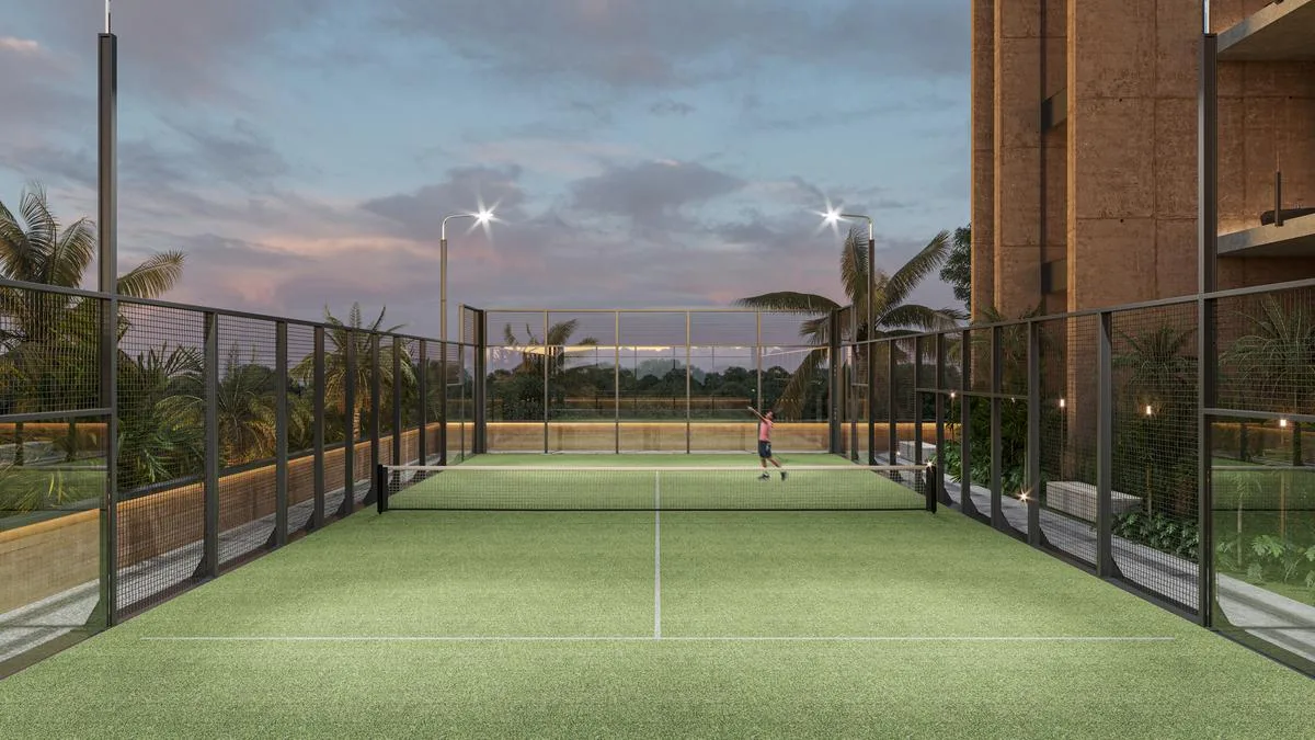 Resident amenities include a private beach club with sunbeds and palapas, an infinity pool facing the sea, a gym and swimming lane, a paddle tennis court, a sky terrace and sky bar with a jacuzzi, a restaurant and room service, a wellness area with a sauna and spa, a coworking space, a game room, a fire pit and lounge area, a lobby with concierge and valet parking, internal transport and electric bicycles, kayaks and paddle boards, and 24-hour security.