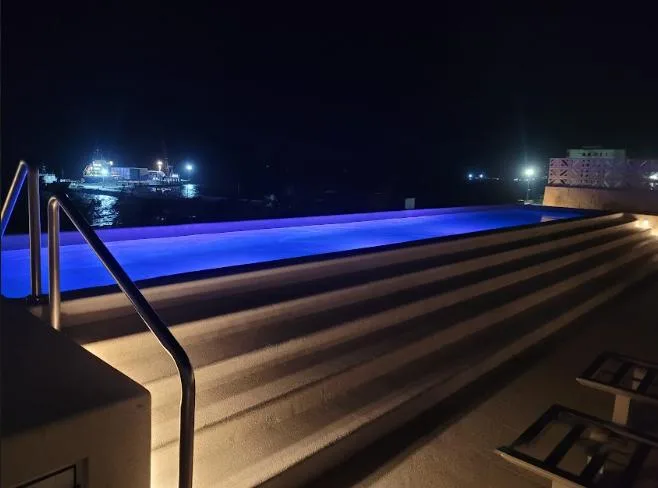 Building amenities include a panoramic rooftop pool, a rooftop terrace with a bar, and elevators. There is 24-hour security, a parking lot, a reception lobby, bicycle racks, and a CCTV system.