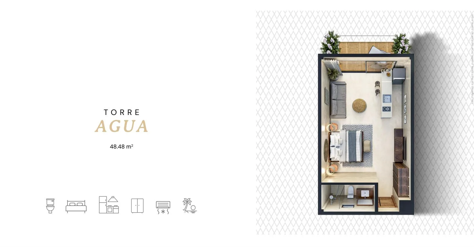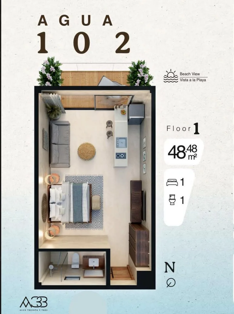 The unit is situated within a property that blends local mysticism with modern design. The 48. 48 square meter space is thoughtfully distributed for maximum comfort and well-being, with every detail curated to create an atmosphere of tranquility and connection.