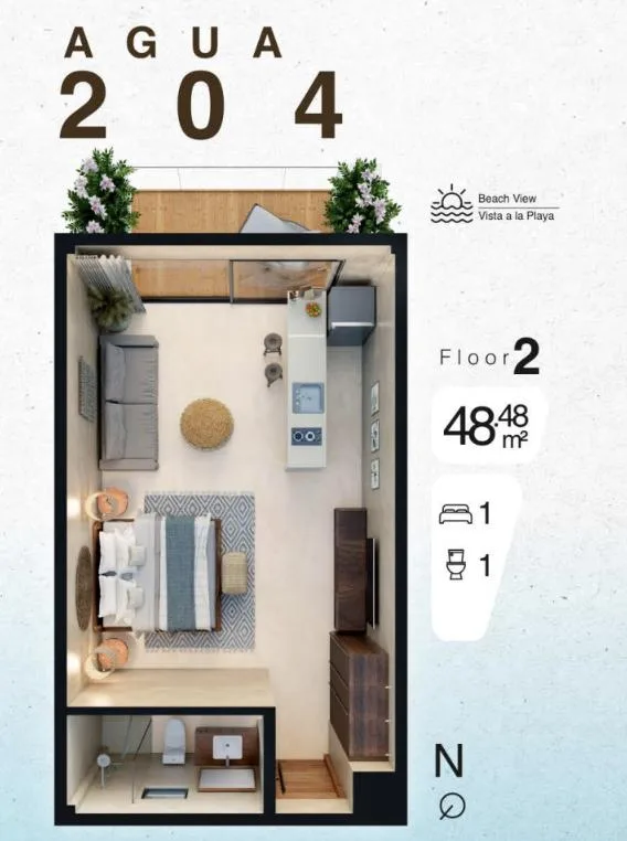 This studio offers coastal living with spectacular panoramic views of both the Caribbean Sea and the lush jungle from the common rooftop area. The setting provides a picturesque backdrop of dazzling sunsets over a protected mangrove park.