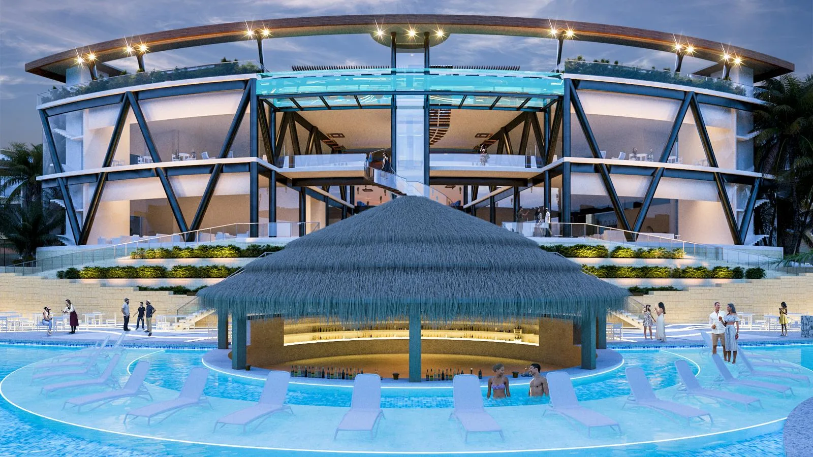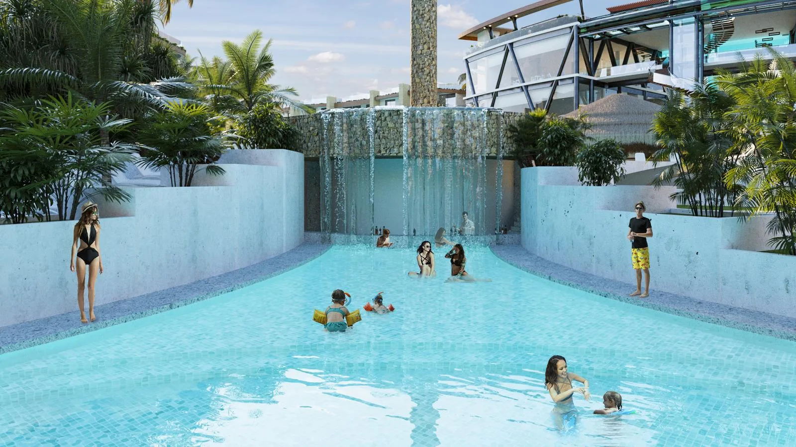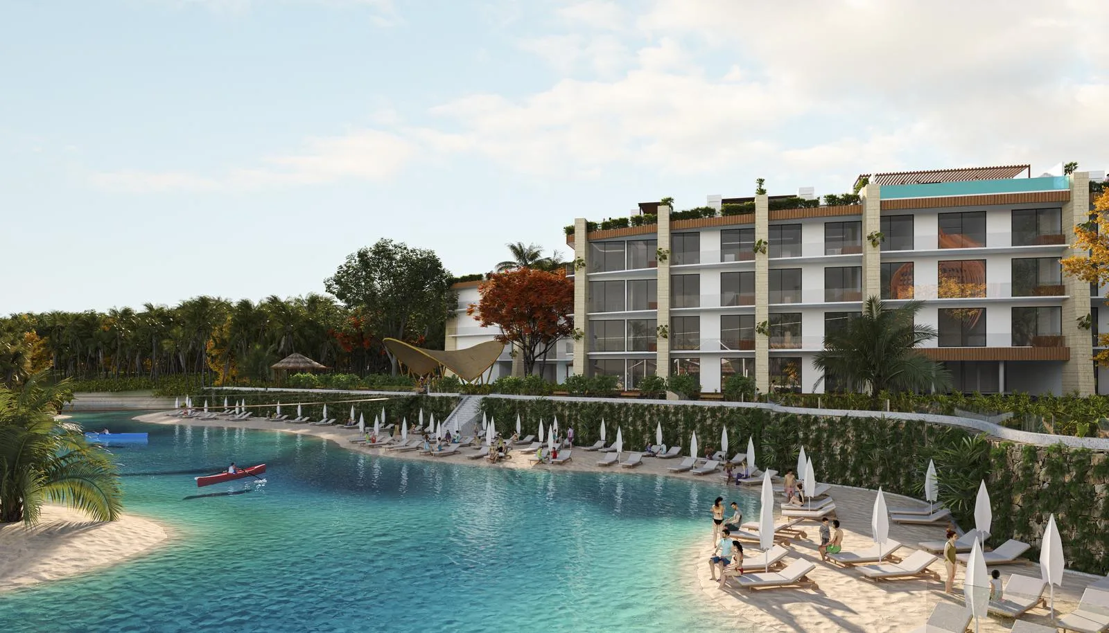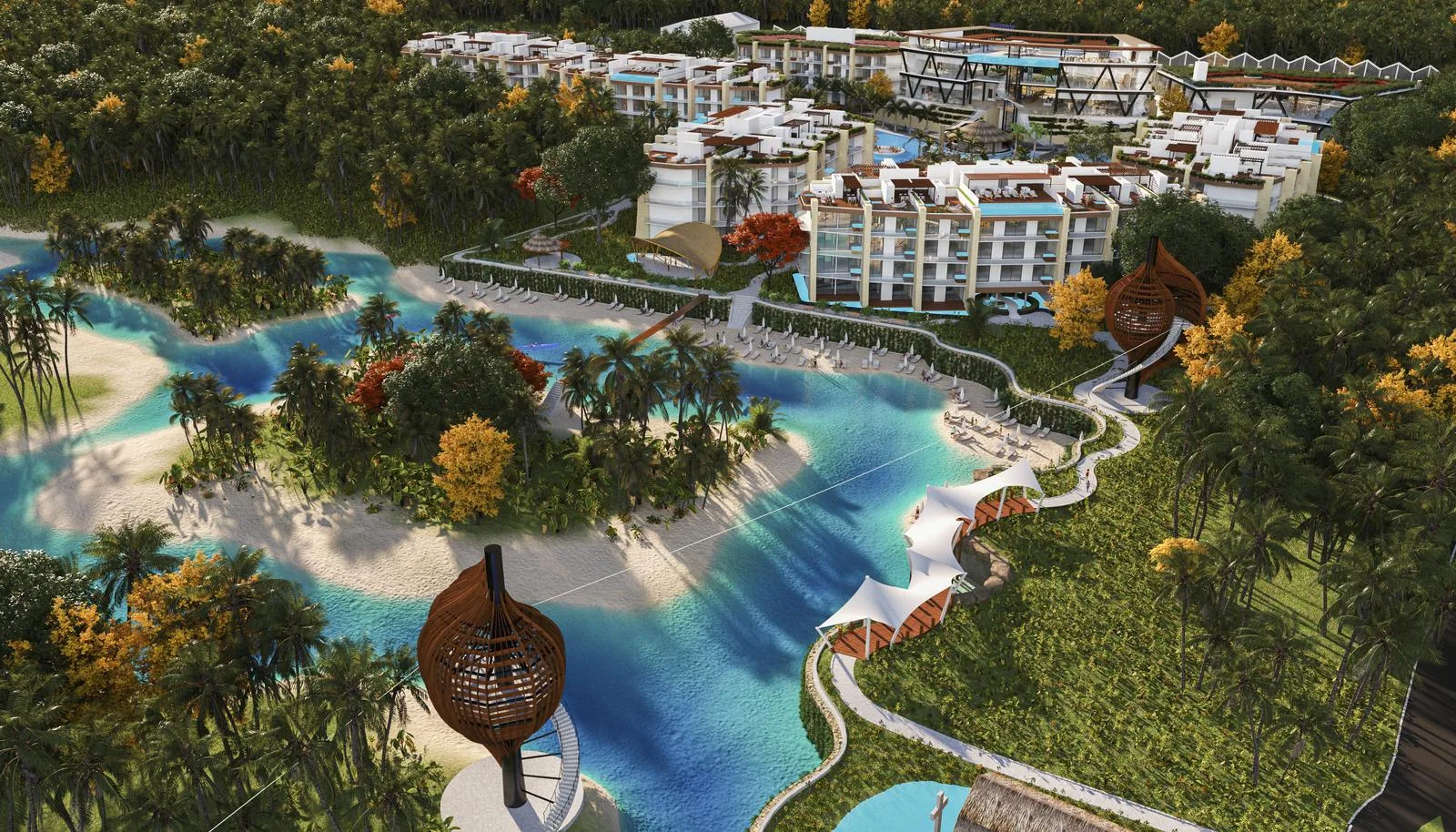 The development features an extensive array of amenities. These include expansive pools, a children's water park, a Lagoon Beach, and a Beach Club. Recreational facilities consist of a climbing wall, a yoga area, walking paths, a lookout point, and a bike station. There is also a natural cenote, an archery range, a batting cage, tennis and paddle tennis courts, and a 300-meter zip line.
