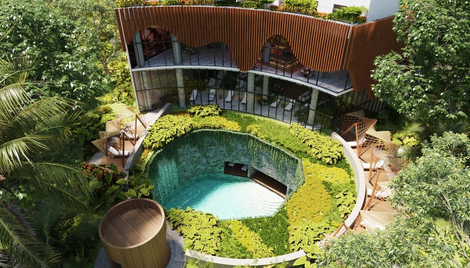 The development features an extensive list of amenities. These include expansive swimming pools, a children's water park, a lagoon beach, and a dedicated beach club. Recreational facilities consist of a climbing wall, yoga area, walking paths, a lookout point, a bike station, a natural cenote, archery, a batting cage, tennis courts, paddle tennis courts, and a 300-meter zipline. There is also a fire pit area, an amphitheater, and an outdoor cinema.