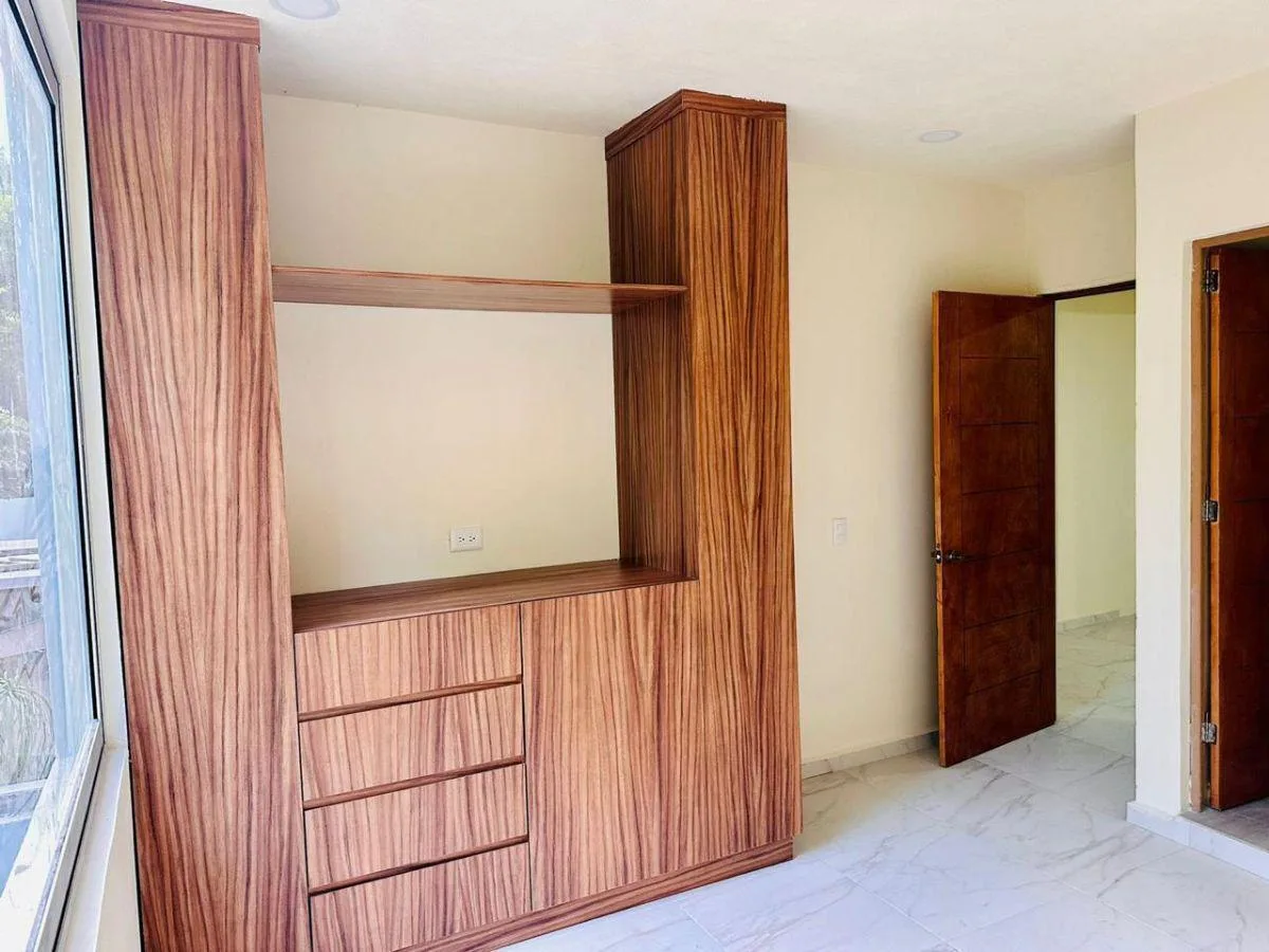 This 271-square-meter house is situated in the Aldea Kiin ECOHABITAT community in Puerto Morelos. It includes three bedrooms and three bathrooms, with spacious and functional layouts.
