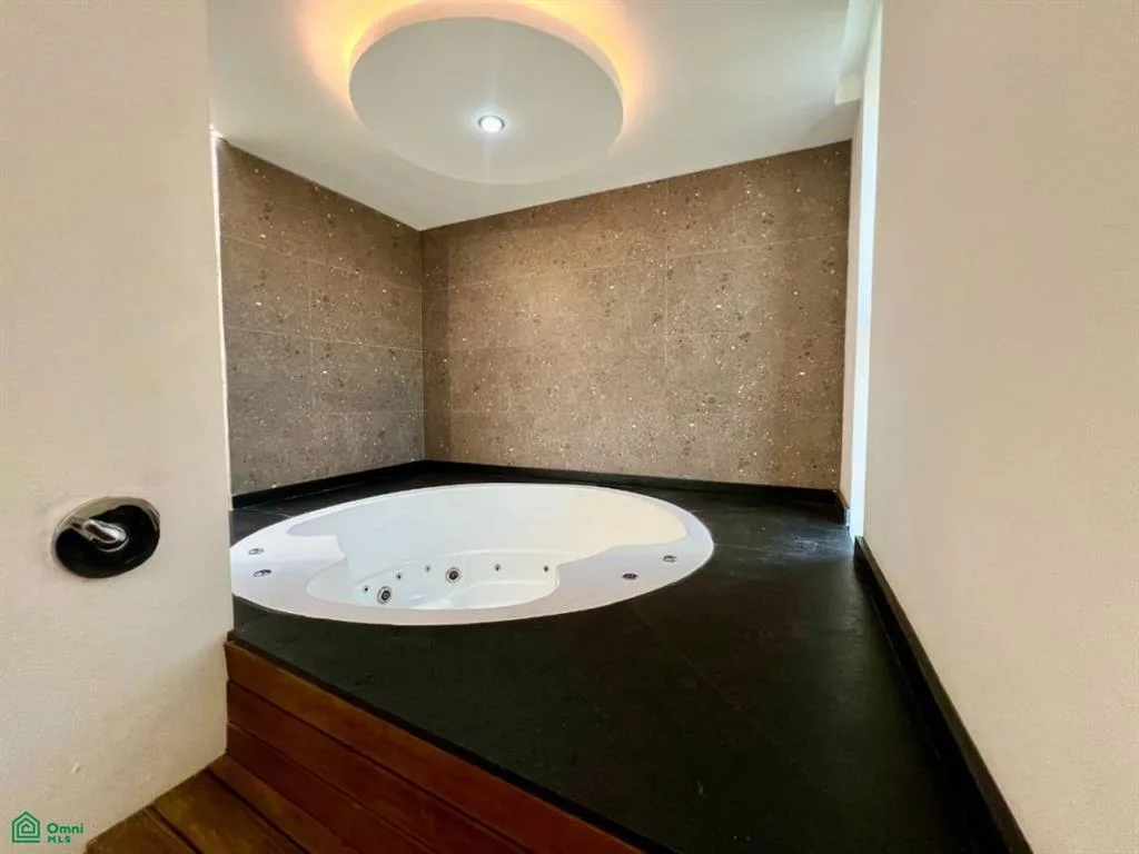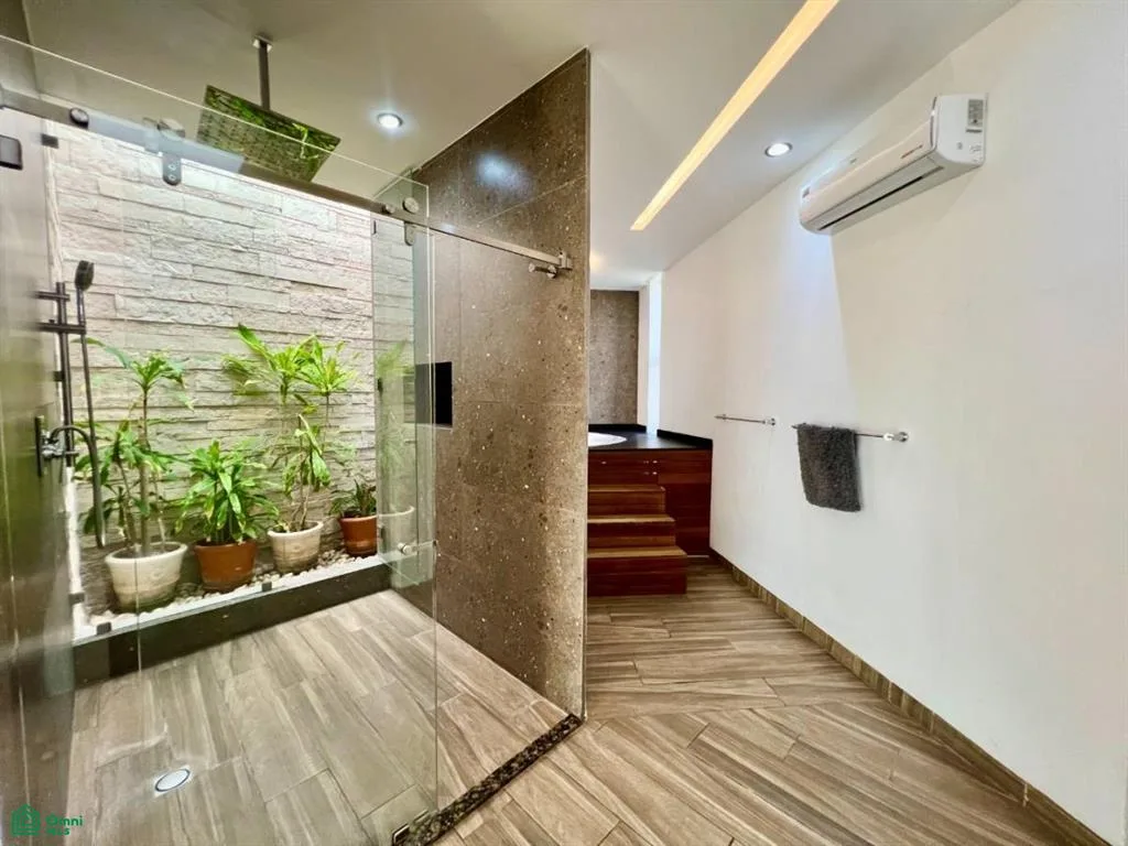 The property includes five bedrooms, four with walk-in closets. The primary suite has an oversized dressing room, an en-suite bathroom with double vanity and jacuzzi, and a balcony overlooking greenery. Two secondary bedrooms also feature private balconies. There are five full bathrooms and one half bathroom, thoughtfully distributed.