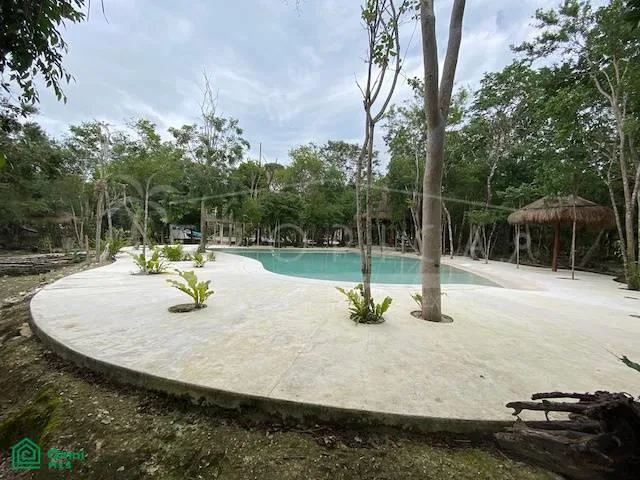 The community provides amenities such as a children’s pool, adult pool, loungers, relaxation areas, a kids’ club, an event palapa, a gym, spacious green areas, wide stamped streets, and underground electricity and cabling.