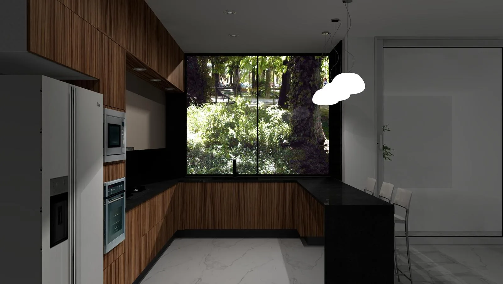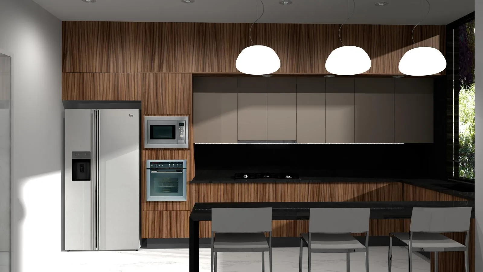 The kitchen is fully equipped with modular parota wood cabinetry, a black San Gabriel granite countertop and bar, a five-burner gas grill, a stainless steel range hood, a 60 cm gas oven, a microwave, and a black monomand tap. The interior features large-format porcelain tile flooring.