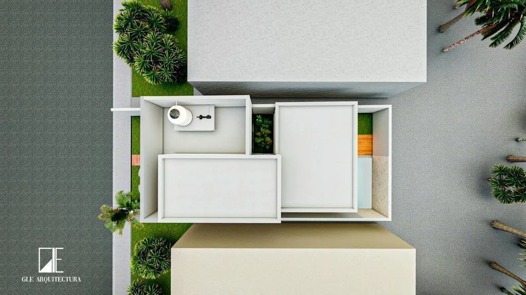 The residence features a double-height access and a double-height living and dining room. The floor plan includes a secondary bedroom with a closet area and a full bathroom, an interior garden, and a primary bedroom with a closet area and a full bathroom. The kitchen features a counter and an island, and the home includes a private pool.