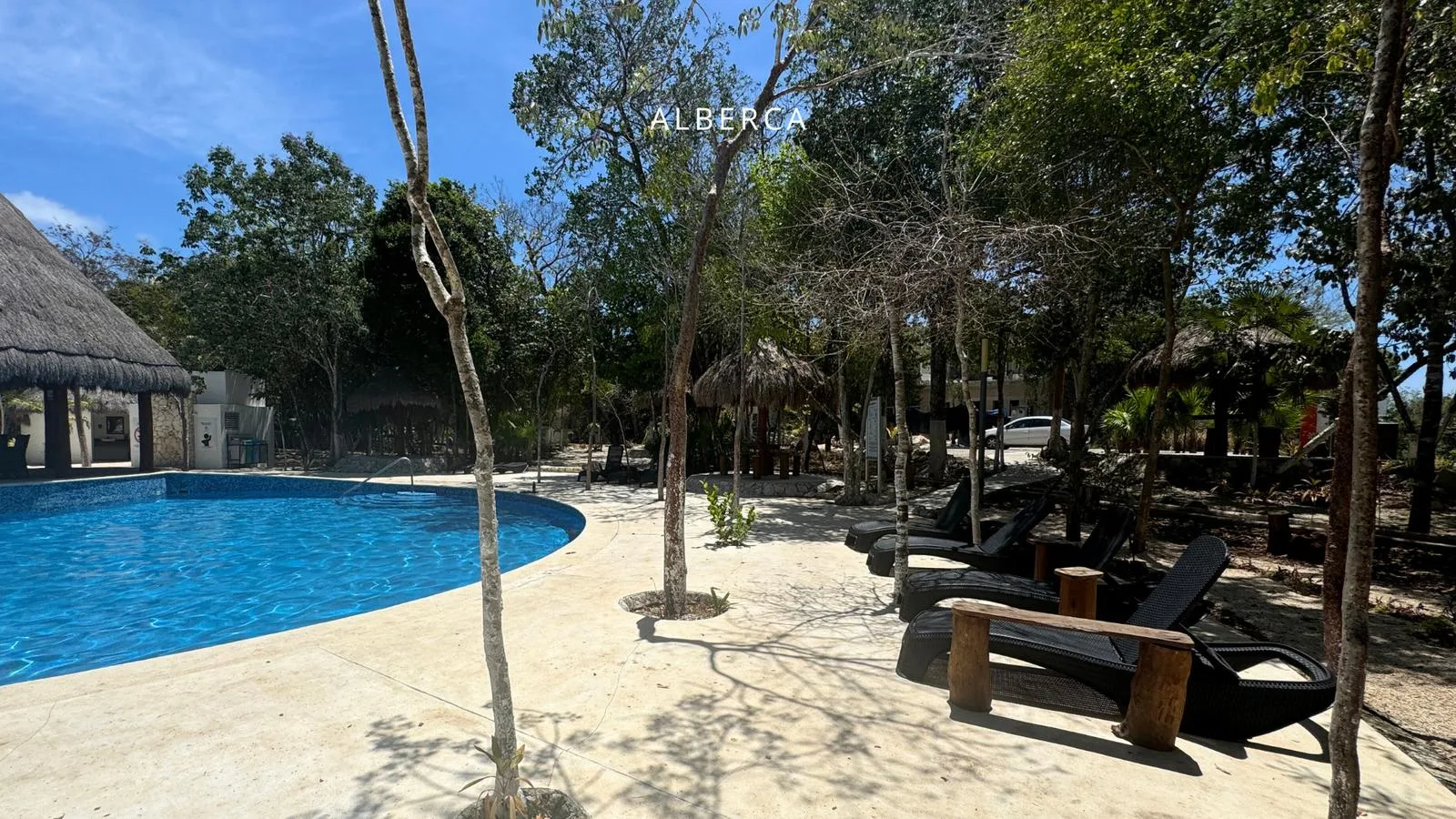 The residential community offers 24/7 security and features a central park with swimming pools, a splash pool, lounge chairs, palapas, an outdoor gym, a cenote, and picnic areas.