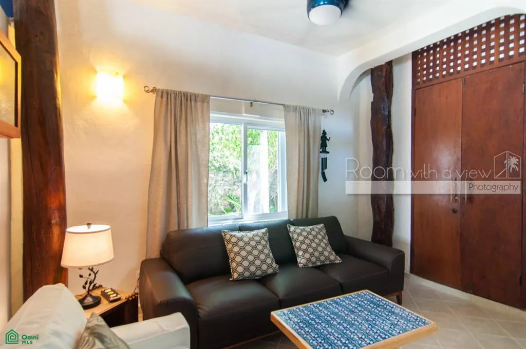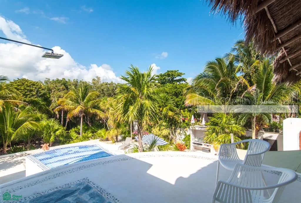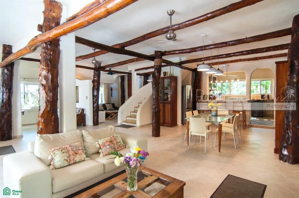 The spacious two-story home was expanded from a traditional Caribbean palapa. Zapote wood posts and long-spanning Palo de Rosa have been organically framed within concrete walls. All interior doors and framing are made of solid cedar. The layout includes a fully equipped kitchen with an island, spacious living and dining areas, and two bedrooms with en suite bathrooms.