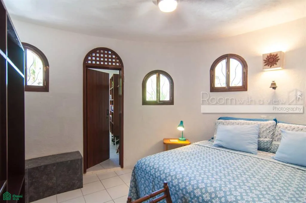 The master bedroom occupies the entire second floor, featuring a high palapa roof and a wrap-around terrace with partial ocean views. It includes a large walk-in closet and a bathroom with an open-air shower. A separate building on the property serves as a dedicated office. The home is equipped with ceiling fans, air conditioning, storm shutters, and a washer and dryer.