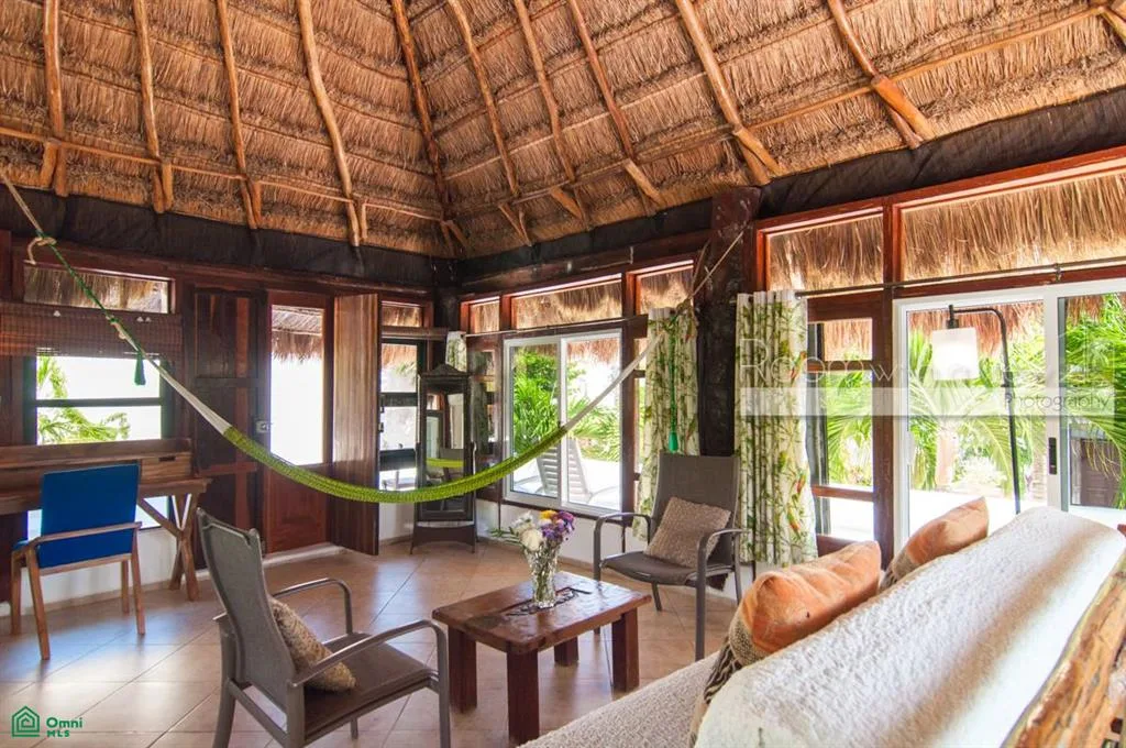 This distinctive beach house enjoys a prime location just north of Puerto Morelos town center. The quiet seaside community is situated approximately halfway between Cancun and Playa del Carmen. The property is directly across the street from the beach and backs onto lush jungle, providing access to white sandy beaches and numerous cenotes within the surrounding Mayan jungle.