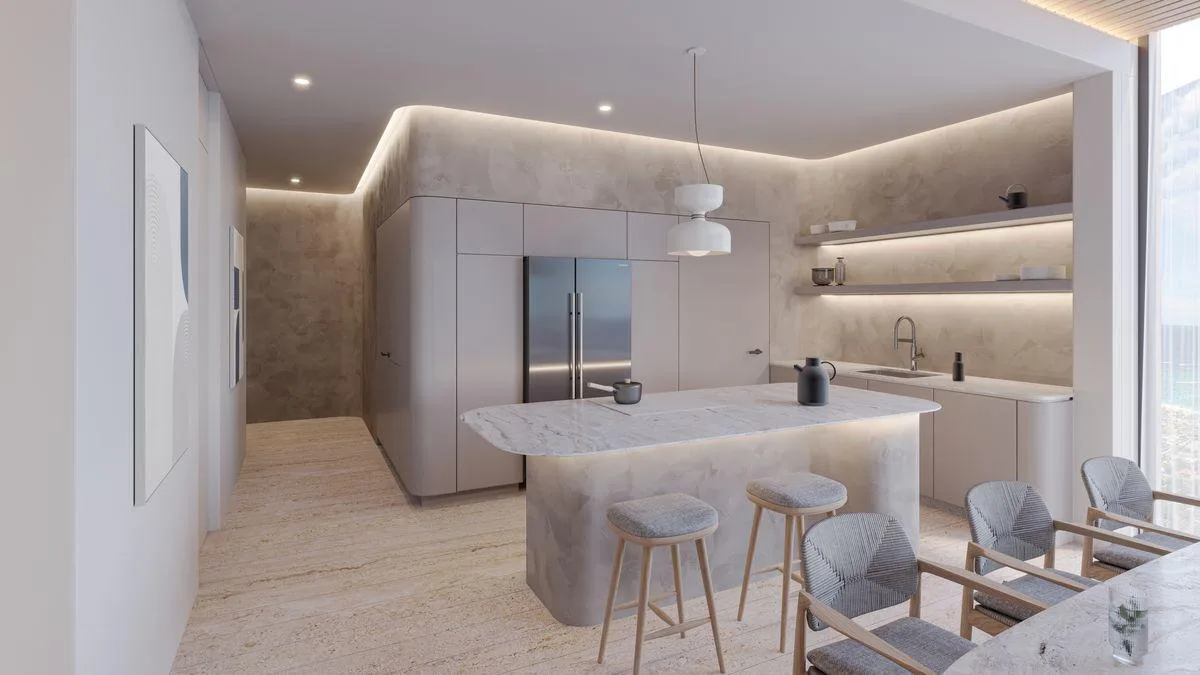 The development provides extensive amenities including a reception area, 24/7 security, a lobby, a paddle tennis court, a gym, a swimming lane, a beach sports cabana, kayaks, paddle boards, an infinite beach pool, pool cabanas, a fire pit, beach cabanas, a sky bar, a jacuzzi, coworking spaces, meeting rooms, a pool restaurant, room service, a beach terrace, a sky terrace, valet service, e-karts, and electric bicycles.