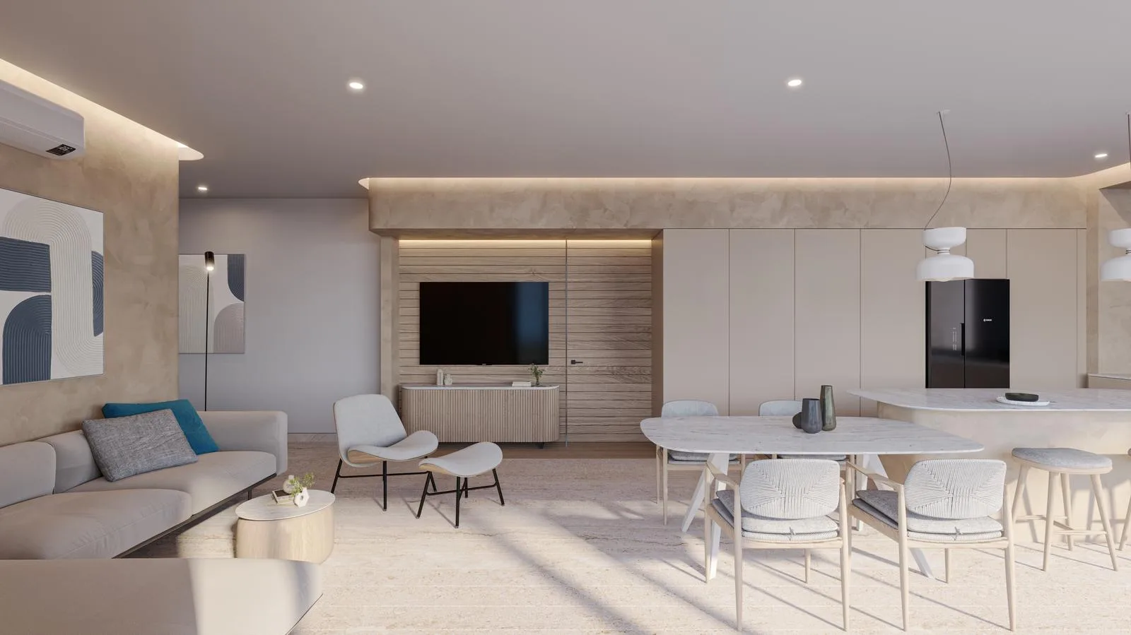 The integrated social area combines a living and dining room with direct access to the terrace. The kitchen is modern and functional.