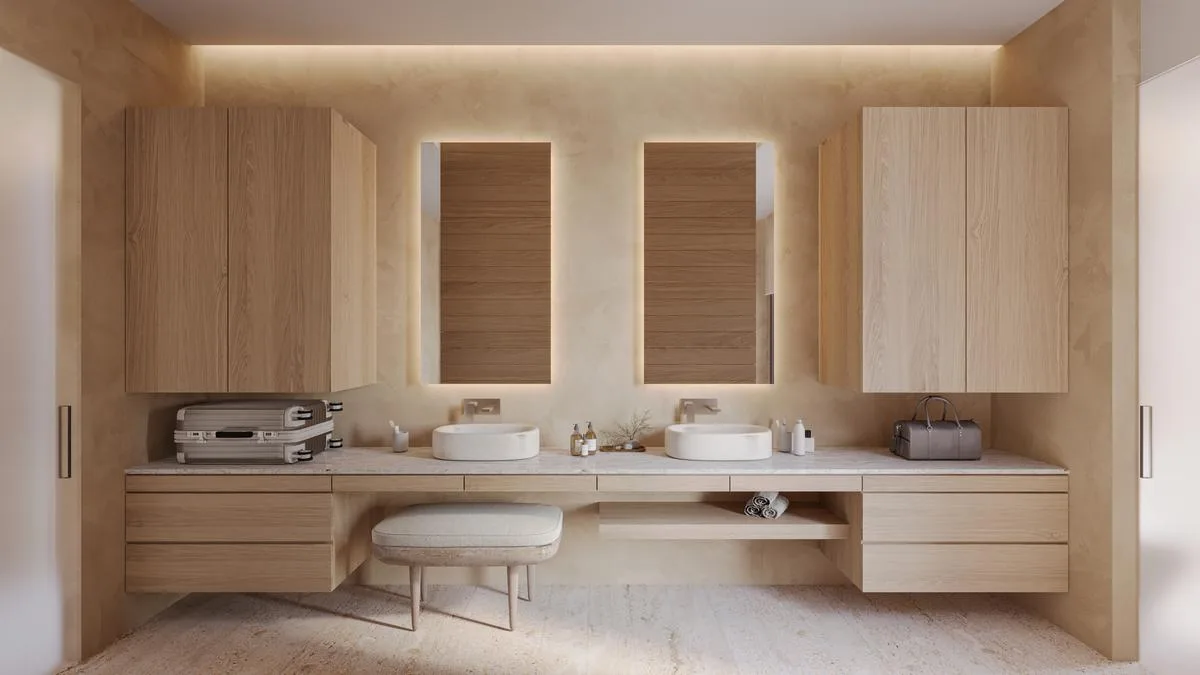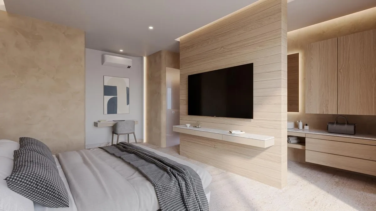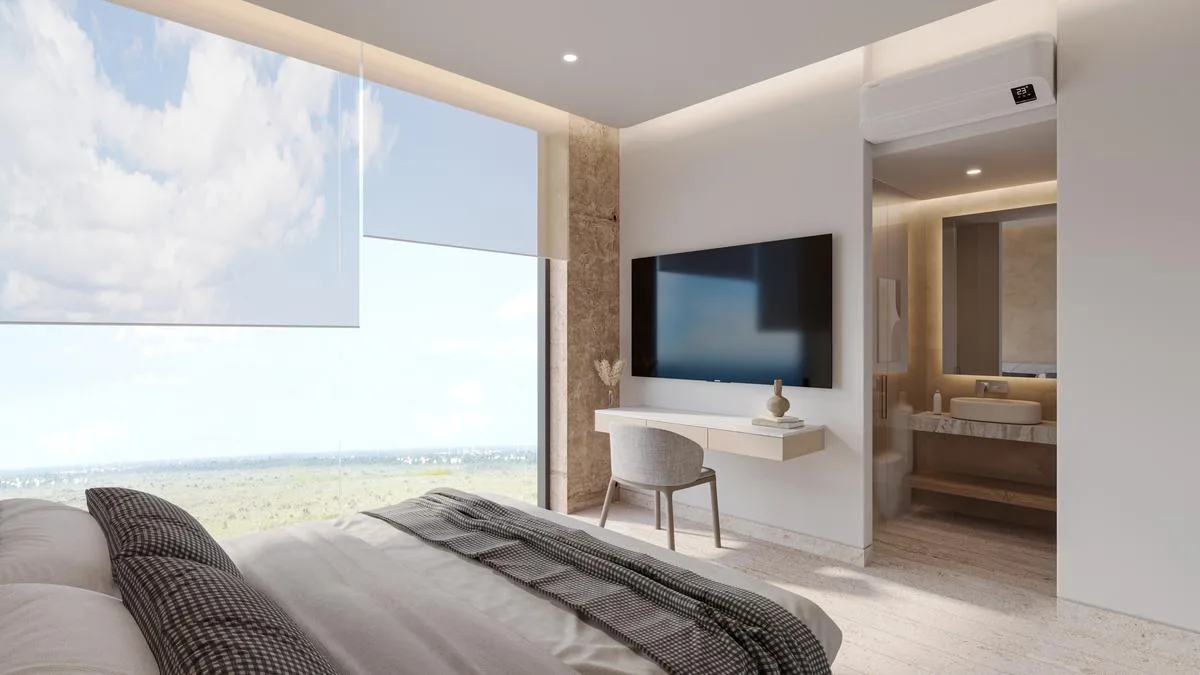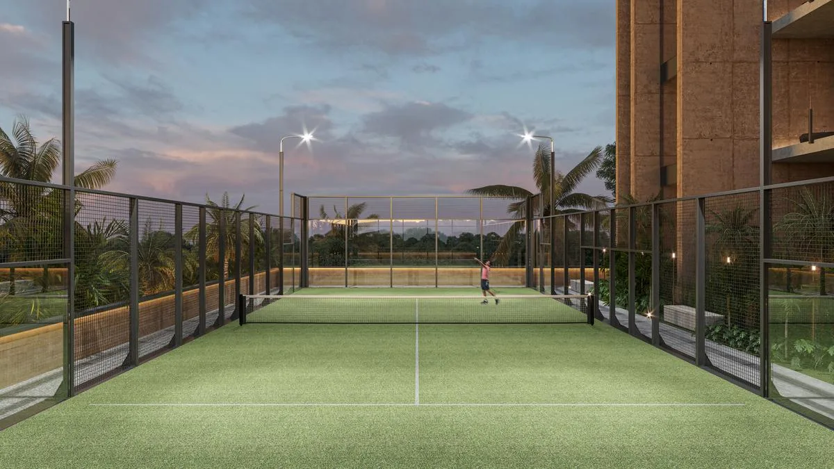 Resident amenities include a private beach club with sunbeds and palapas, an infinity pool facing the sea, a gymnasium with a swimming lane, and a paddle tennis court. There is a sky terrace and sky bar with a jacuzzi, a restaurant with room service, and a wellness area with a sauna and spa. Additional facilities include coworking spaces, a game room, a fire pit lounge, and a lobby with concierge and valet parking. Internal transportation and electric bicycles are provided. Water sports equipment such as kayaks and paddle boards are available. The development provides 24-hour security.