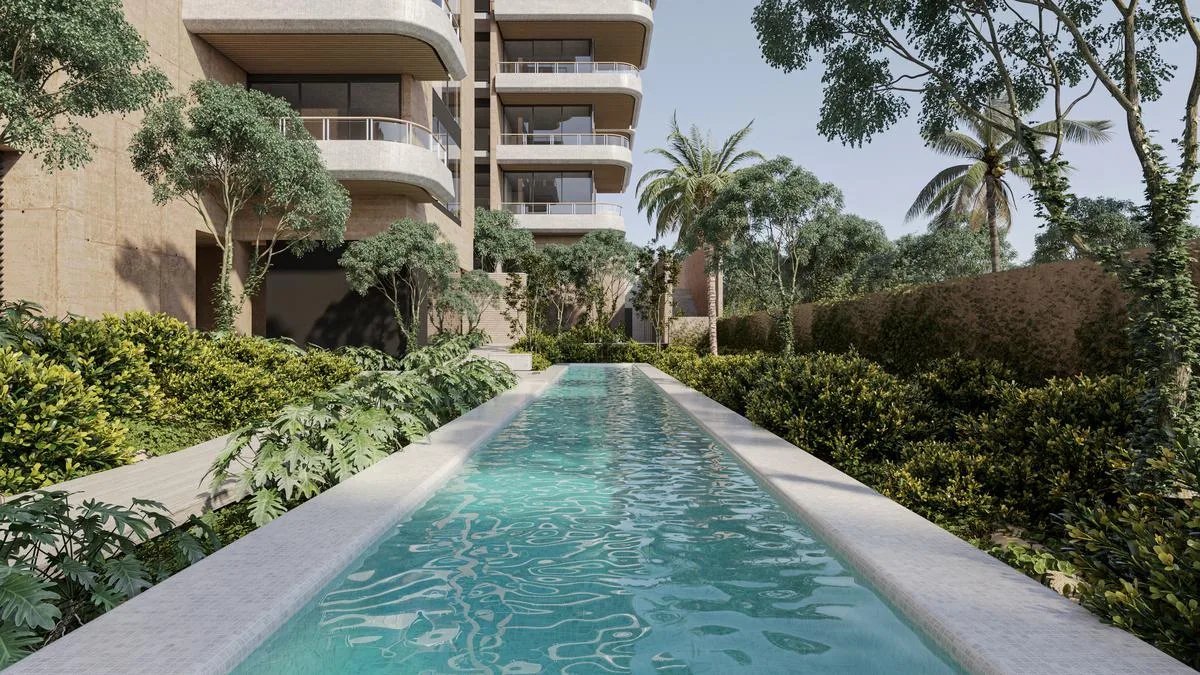 This beachfront development on the Caribbean Sea combines contemporary design with ecological awareness. It offers sunrise ocean views and is designed with sustainable principles, featuring natural materials, cross ventilation, energy efficiency, and open spaces with panoramic sea views.