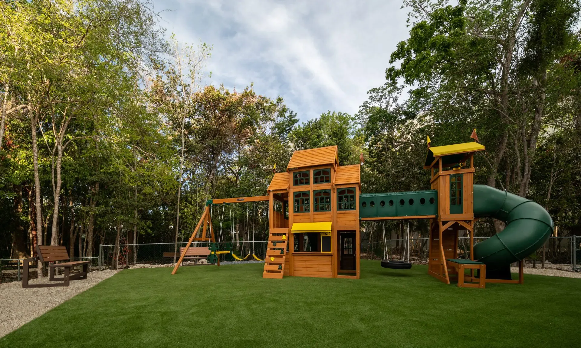 The community offers more than 30 amenities. These include a gated entrance with controlled access, multiple swimming pools including family, adults-only, and children's pools, a pool bar, and a clubhouse. Additional features are a coworking space, a yoga area, an outdoor gym, a tennis court, a pickleball court, and a multi-sport court. The grounds also contain walking and jogging paths, a playground, a fire pit area, hammock zones, pet-friendly areas, and landscaped green spaces. On-site storage units are available.