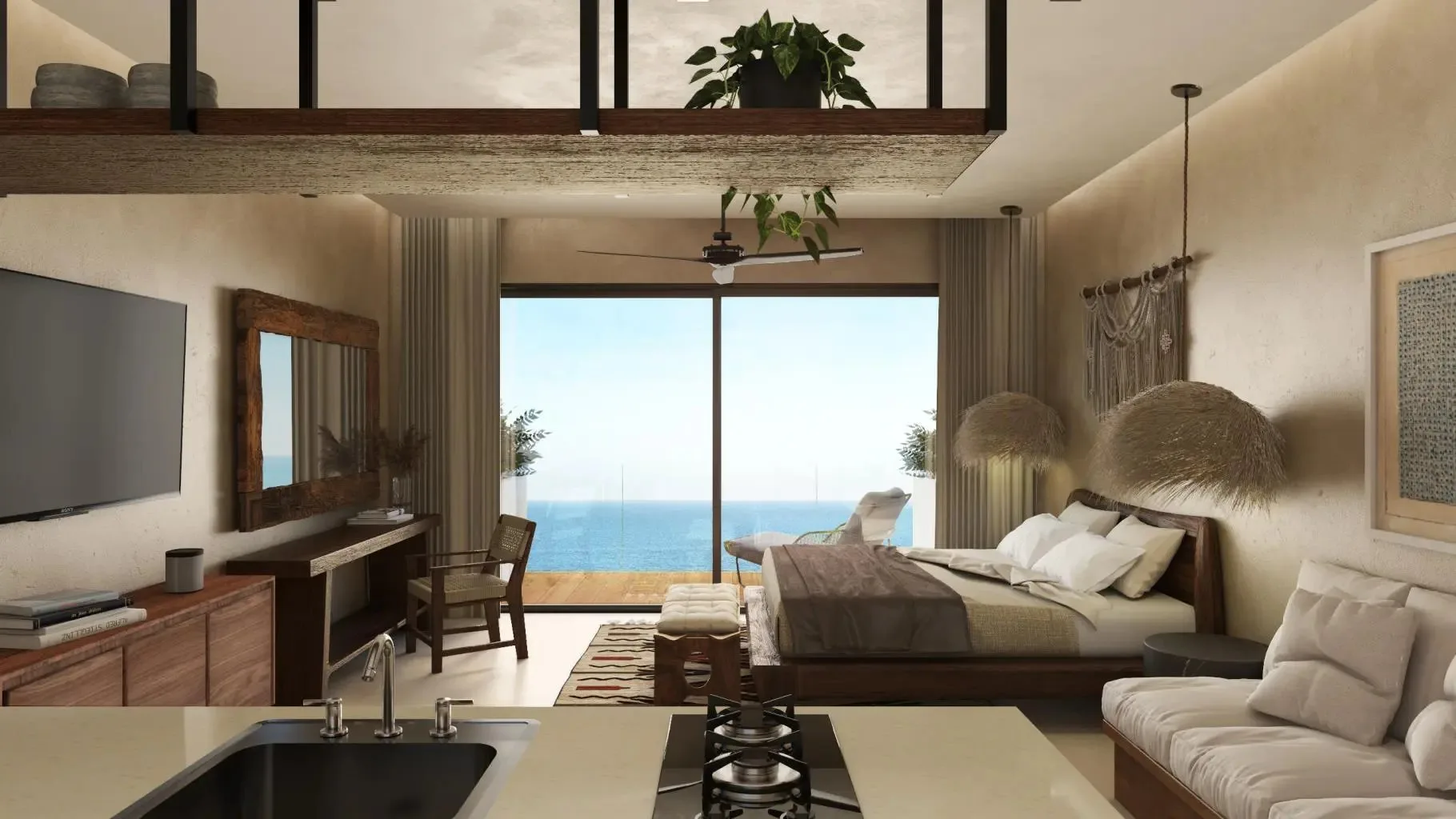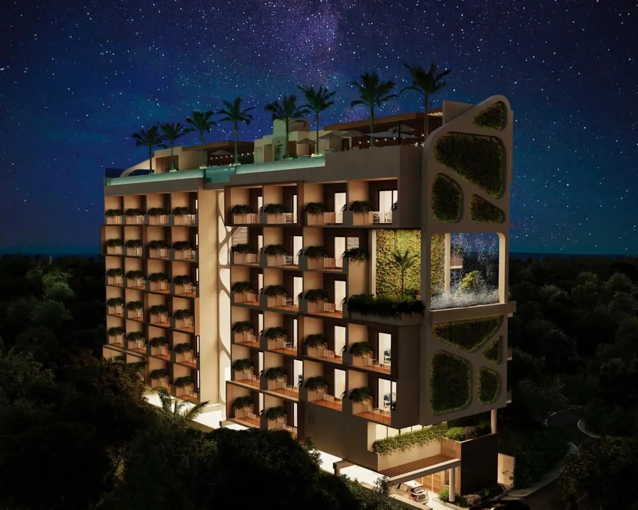 This property is located next to the beach in Puerto Morelos. It features an incredible 50-meter roof garden that offers panoramic views overlooking the sea, providing an ideal space to enjoy sunrises.