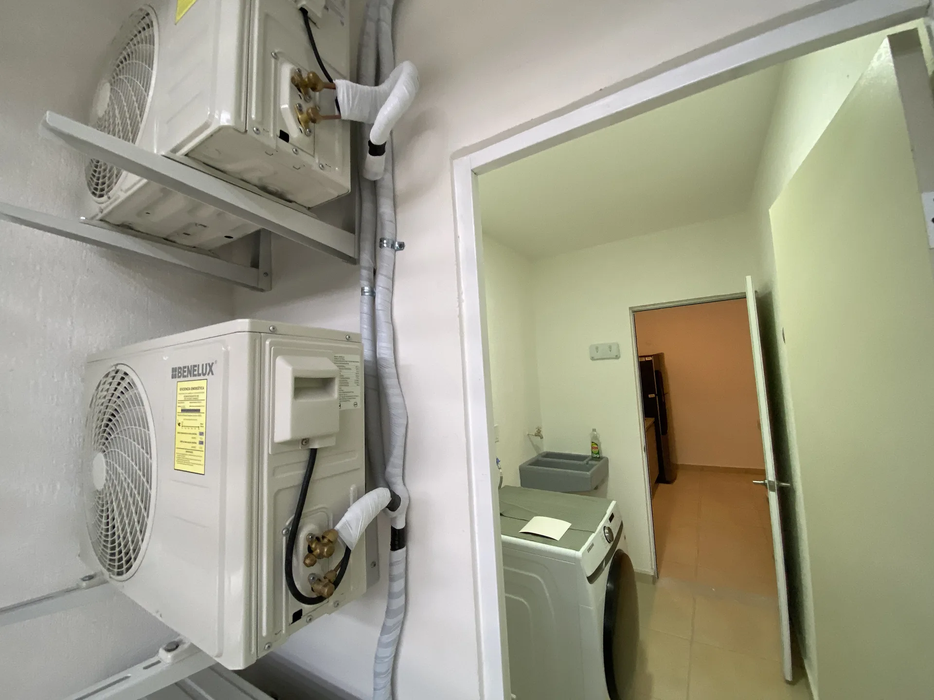 Apartments with three balconies offer two bedrooms and two bathrooms, a kitchen, a living and dining room, and a service area. These units have an interior area of 79. 59 square meters, a balcony area of 10. 41 square meters, and a total area of 90 square meters.