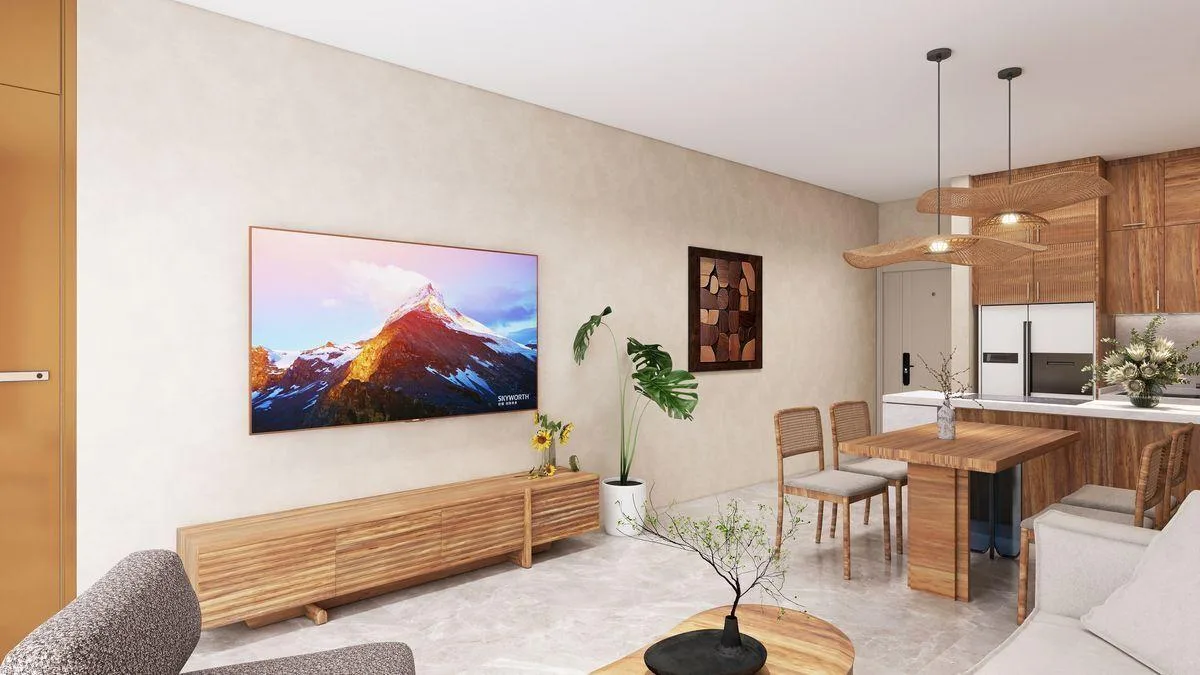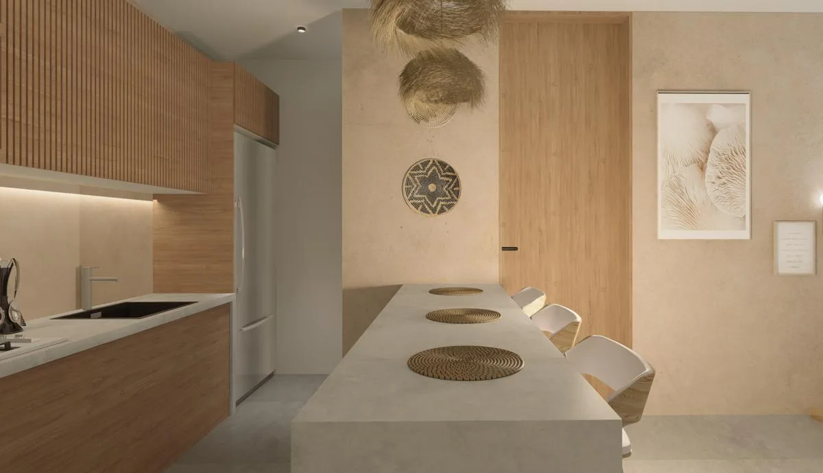 This residence is a two-bedroom prototype. The interior measures 98. 51 square meters and includes a 19. 61 square meter terrace. The layout features two bedrooms, one configured as a lock-off unit, and two full bathrooms. The home includes a fully equipped kitchen, a combined living and dining area, a laundry space, and a terrace with pre-installation for a jacuzzi.