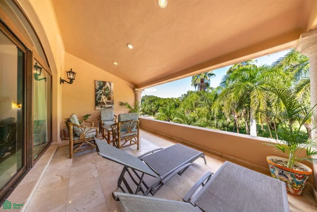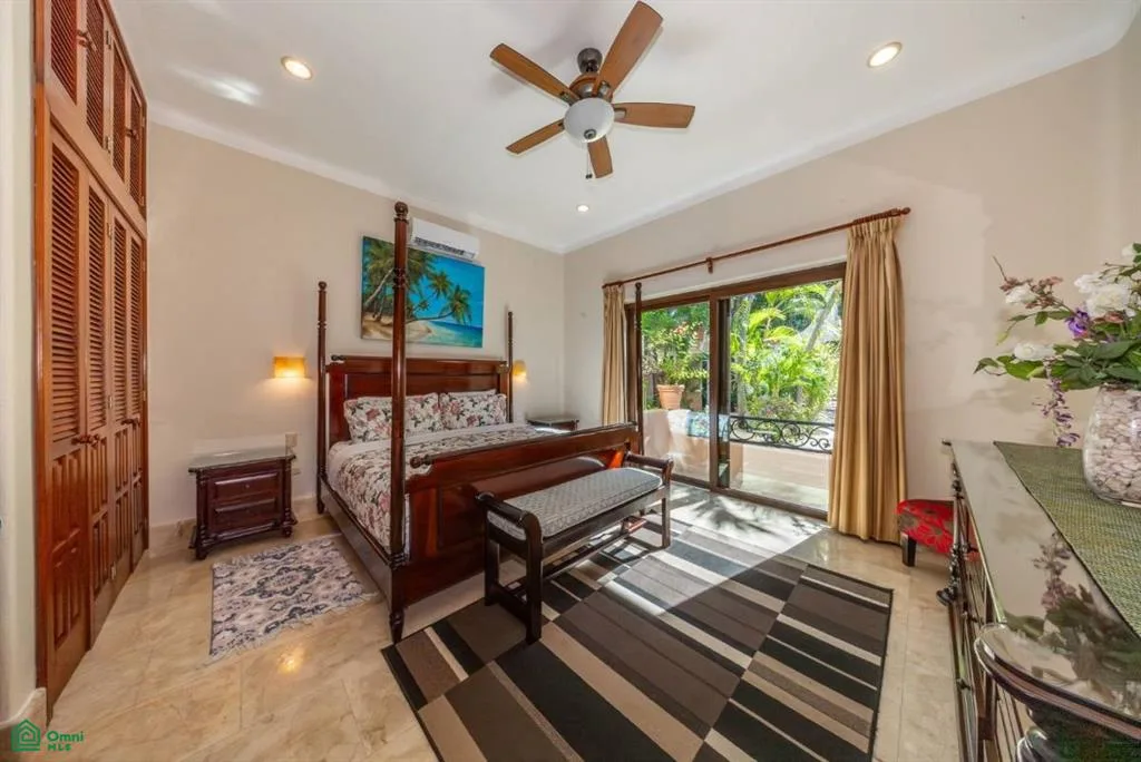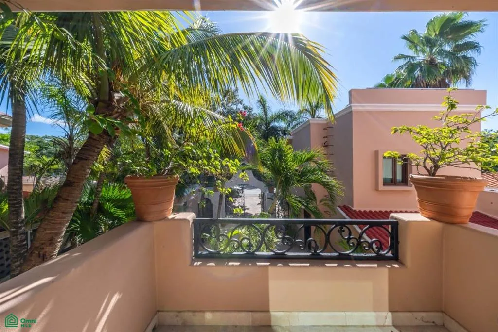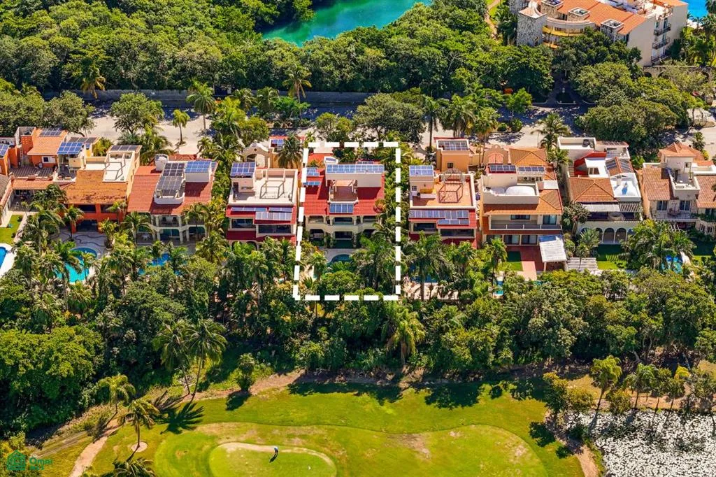 Villa Orquidea is located in a prime golf-front position within the gated community of Puerto Aventuras. Handcrafted wrought iron gates and sculpted stone masonry open into a finished entrance courtyard. Mature tropical gardens with palms, birds of paradise, and lush greenery surround the home, providing privacy and shade.