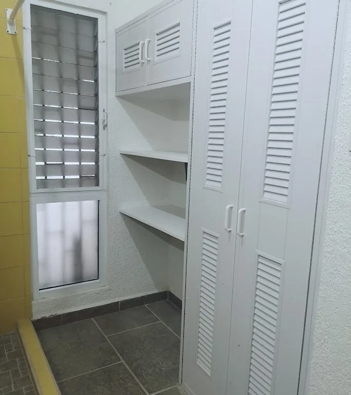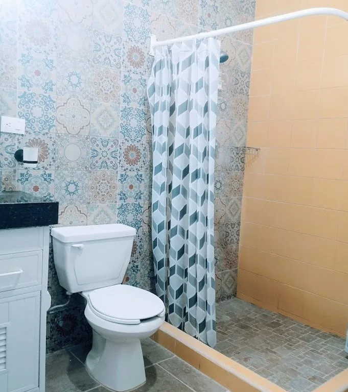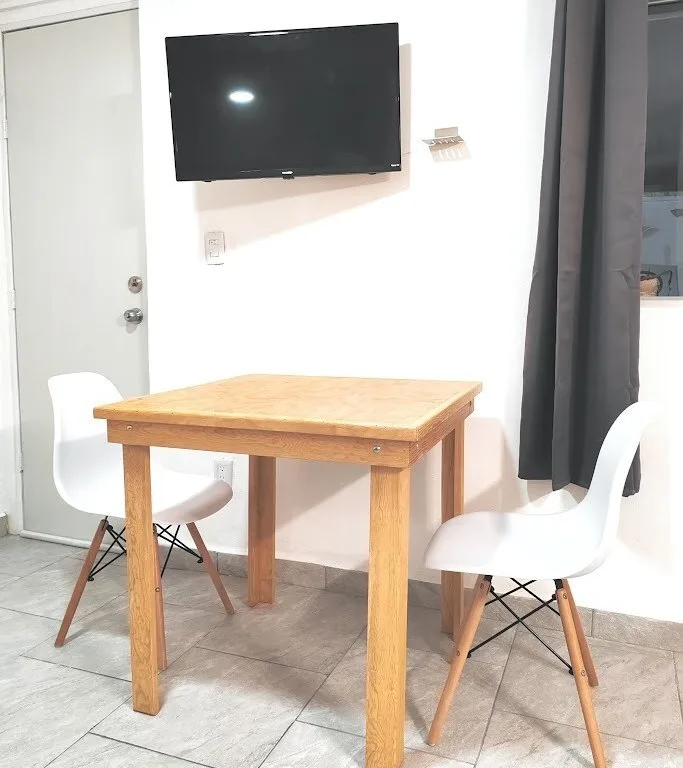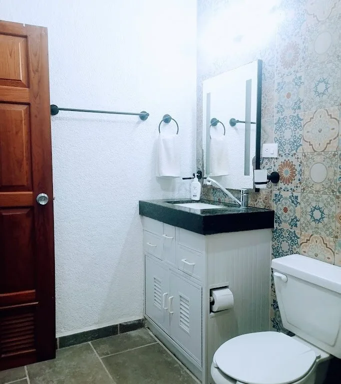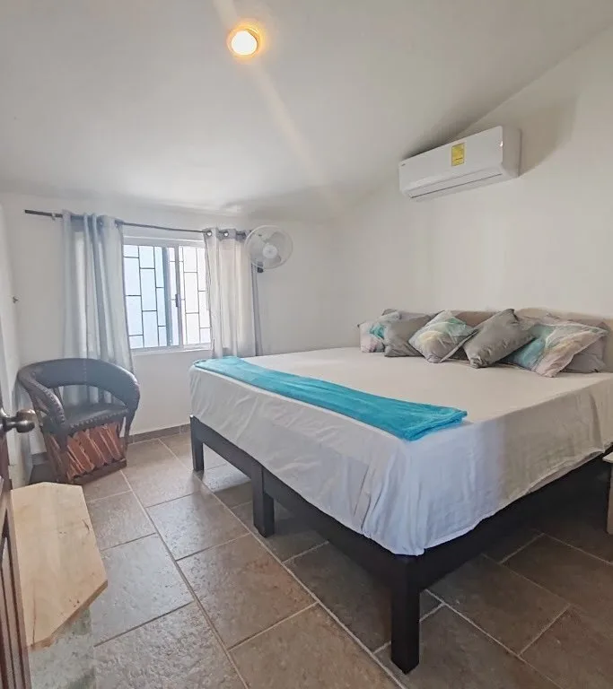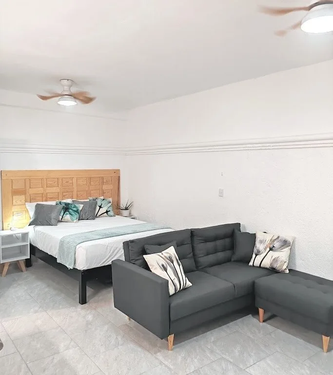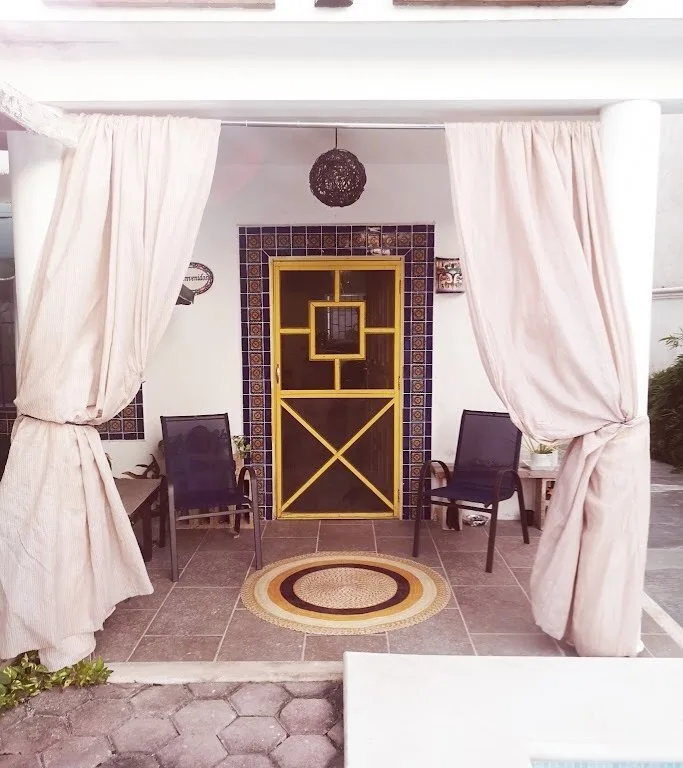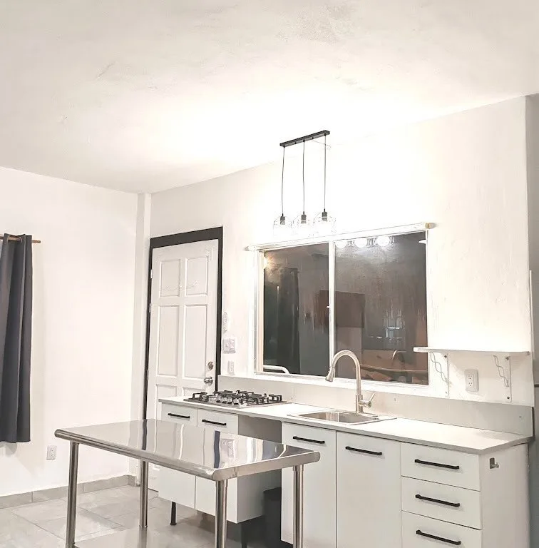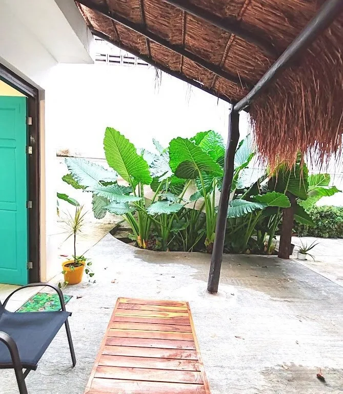 The independent guest house was built in 2024 and is designed as an open-concept studio. It contains a full kitchen, a bathroom, a combined dining and living area, a resting area, and a private outdoor terrace with a palapa.