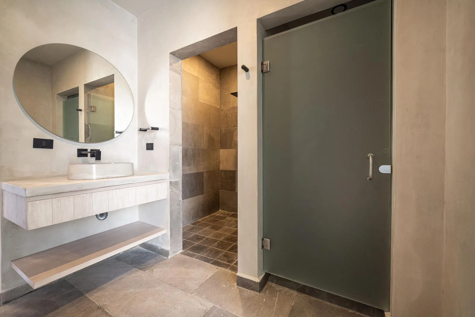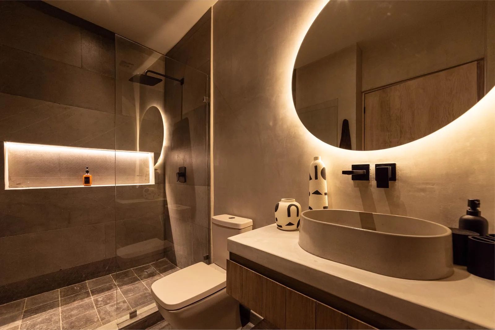 High-quality finishes are found throughout, including exposed concrete on walls, floors, and ceilings. Light-toned and aged-effect walnut woods are used alongside black marble countertops. The property features warm-tone indirect LED lighting, as well as black concrete kitchens and furnishings.