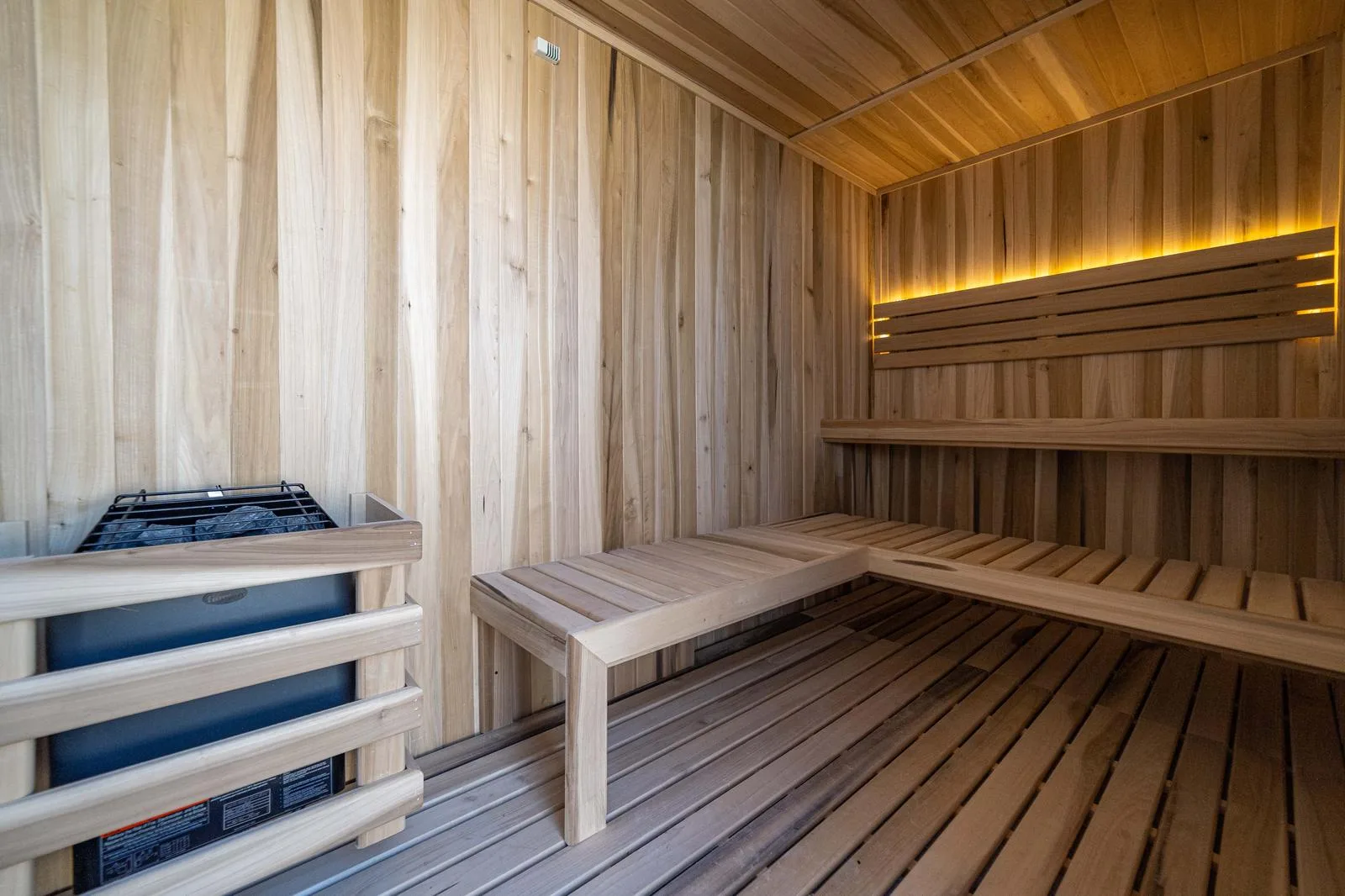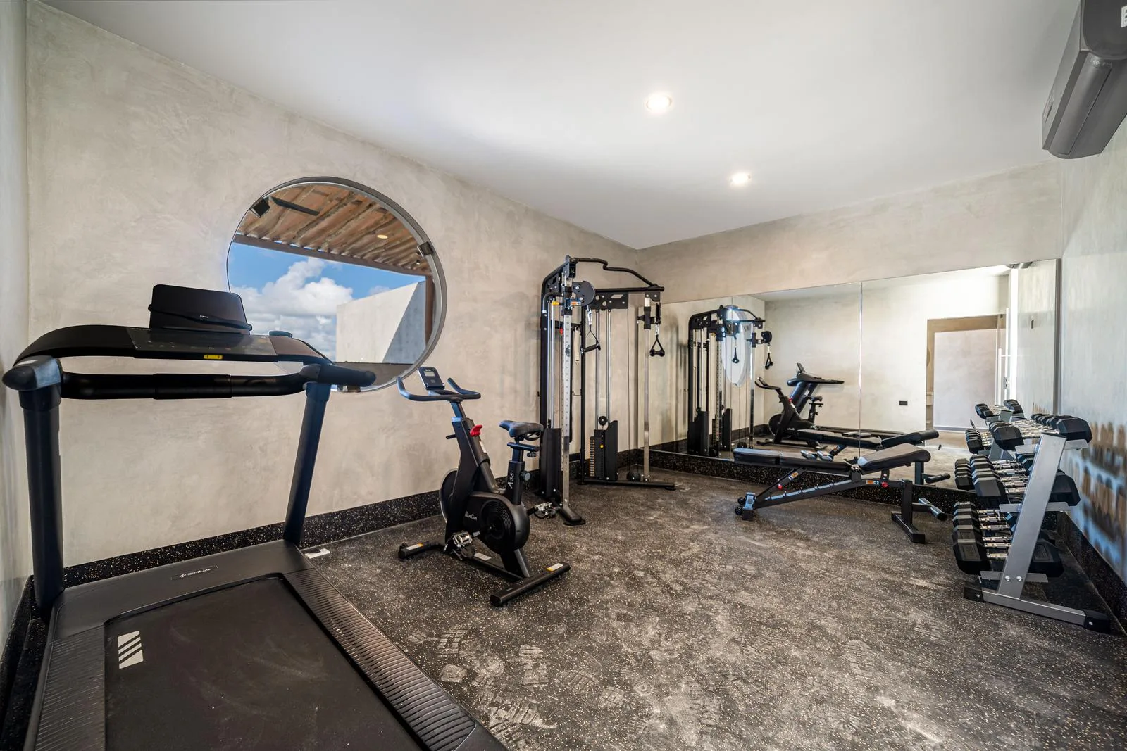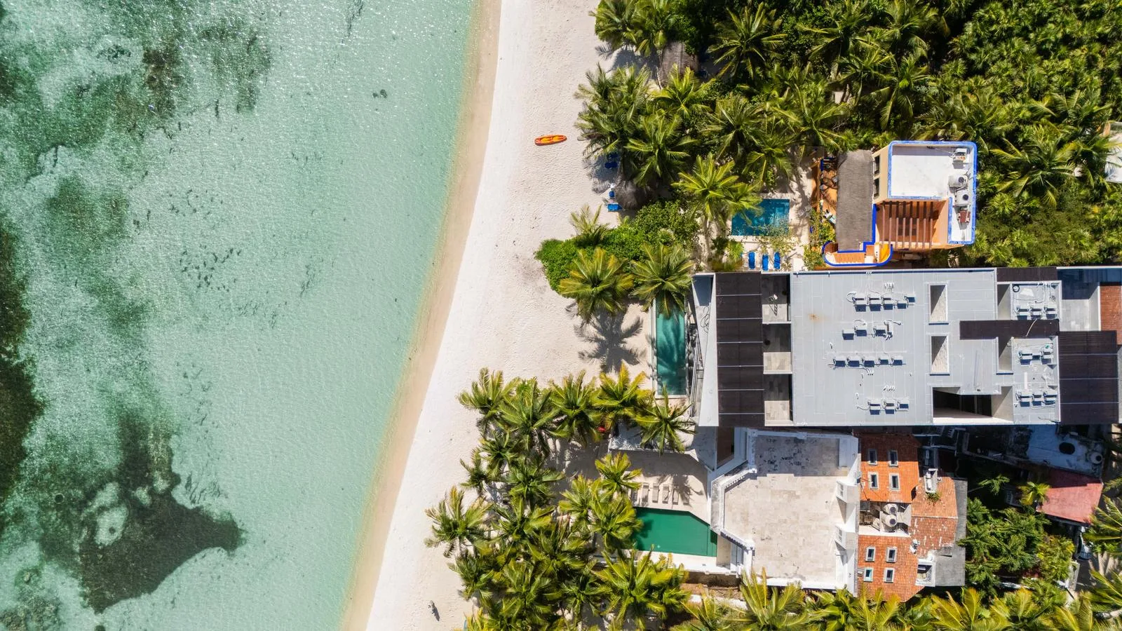 The property offers a comprehensive suite of amenities. On the ground level, residents have access to a lobby, a beach club with direct beach access, an infinity pool, and a bar and kitchen area equipped with Starlink internet. The rooftop features a separate bar and pool, a sauna, a gym, a fire pit, and a sundeck area.