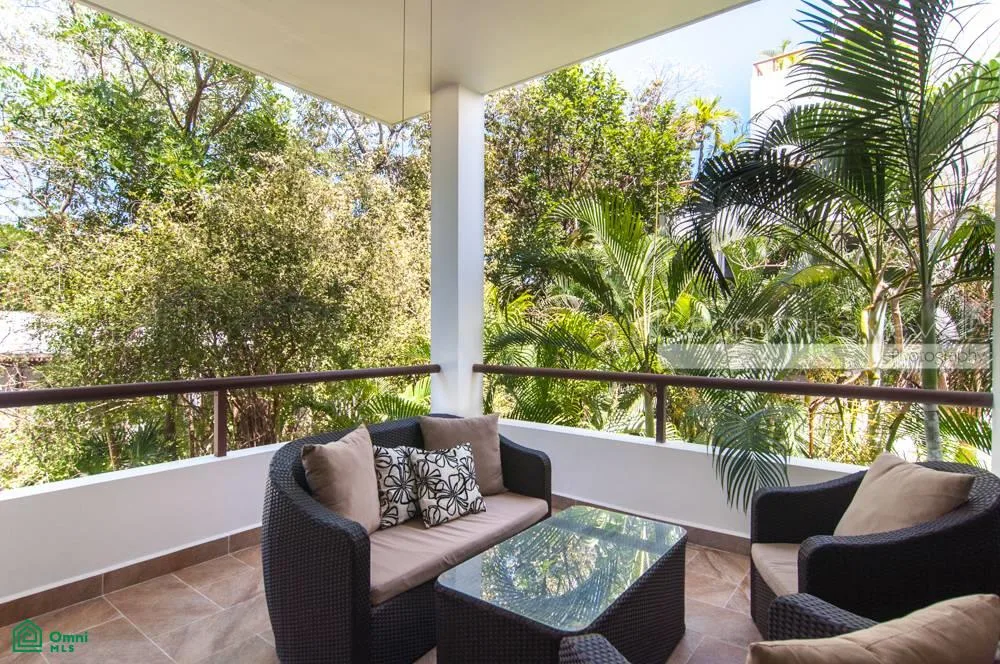 This bright and airy two-bedroom, two-bathroom condo offers a modern and comfortable living space. Its open-concept design features a kitchen with premium appliances, a spacious living and dining area, and a laundry room. Large sliding glass doors in the living room and primary bedroom open onto a covered balcony with jungle views.