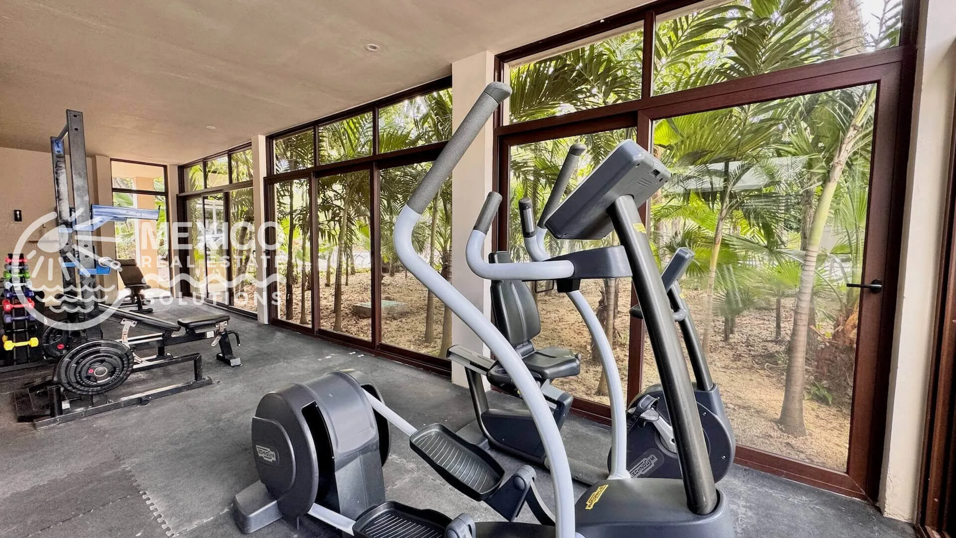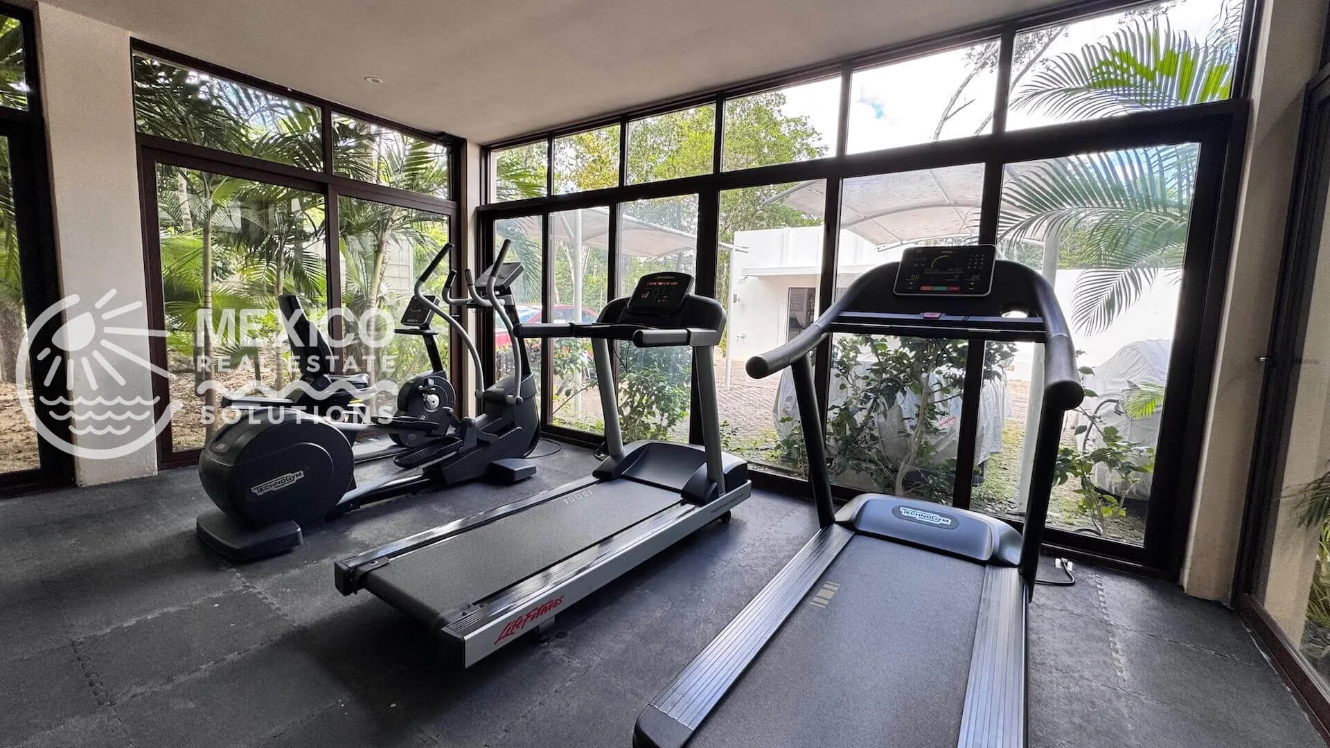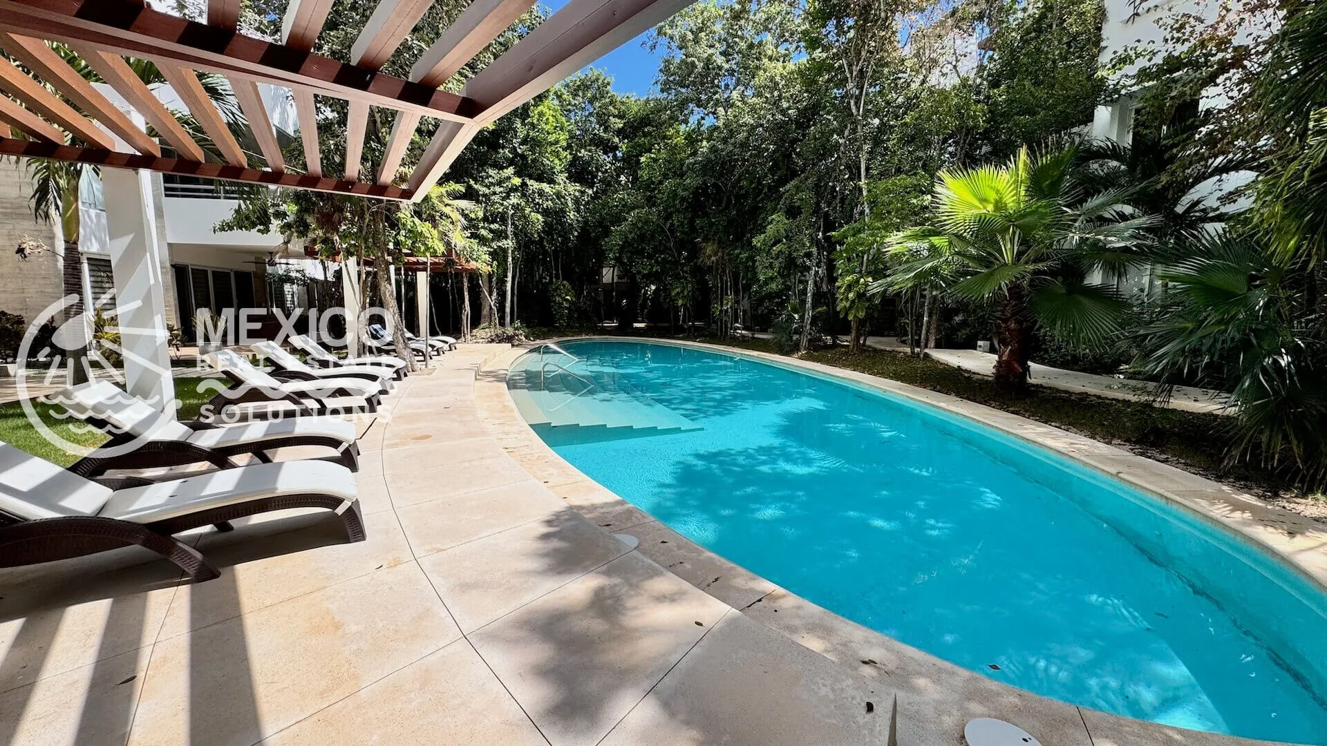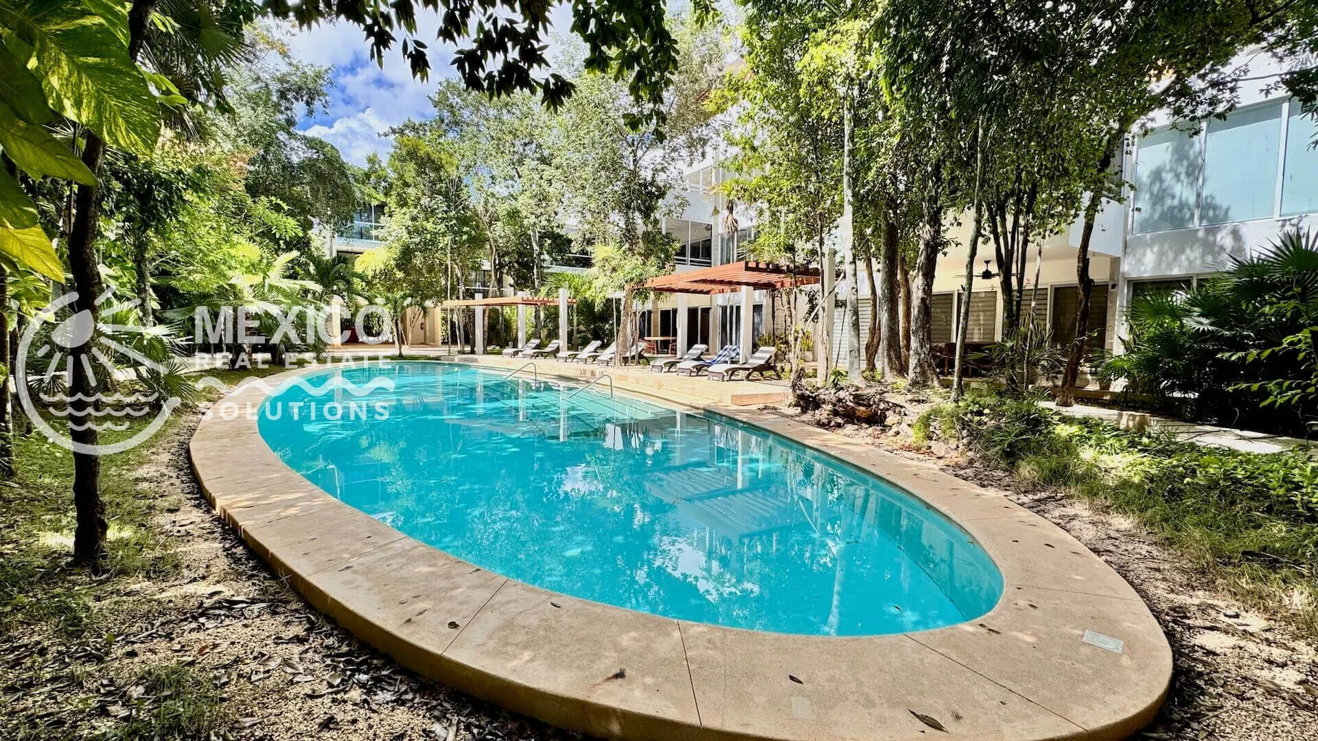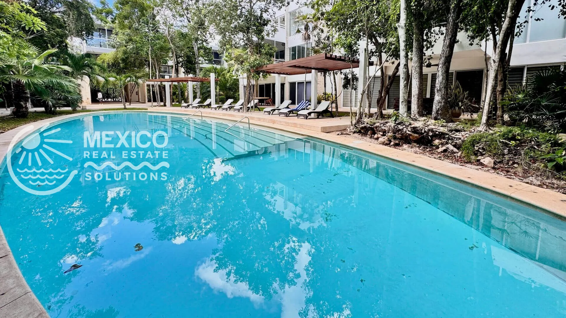 The community features two pools with loungers, a yoga palapa, 24-hour gated security, on-site reception and management, lush tropical landscaping, shaded walkways, and parking with bike racks.
