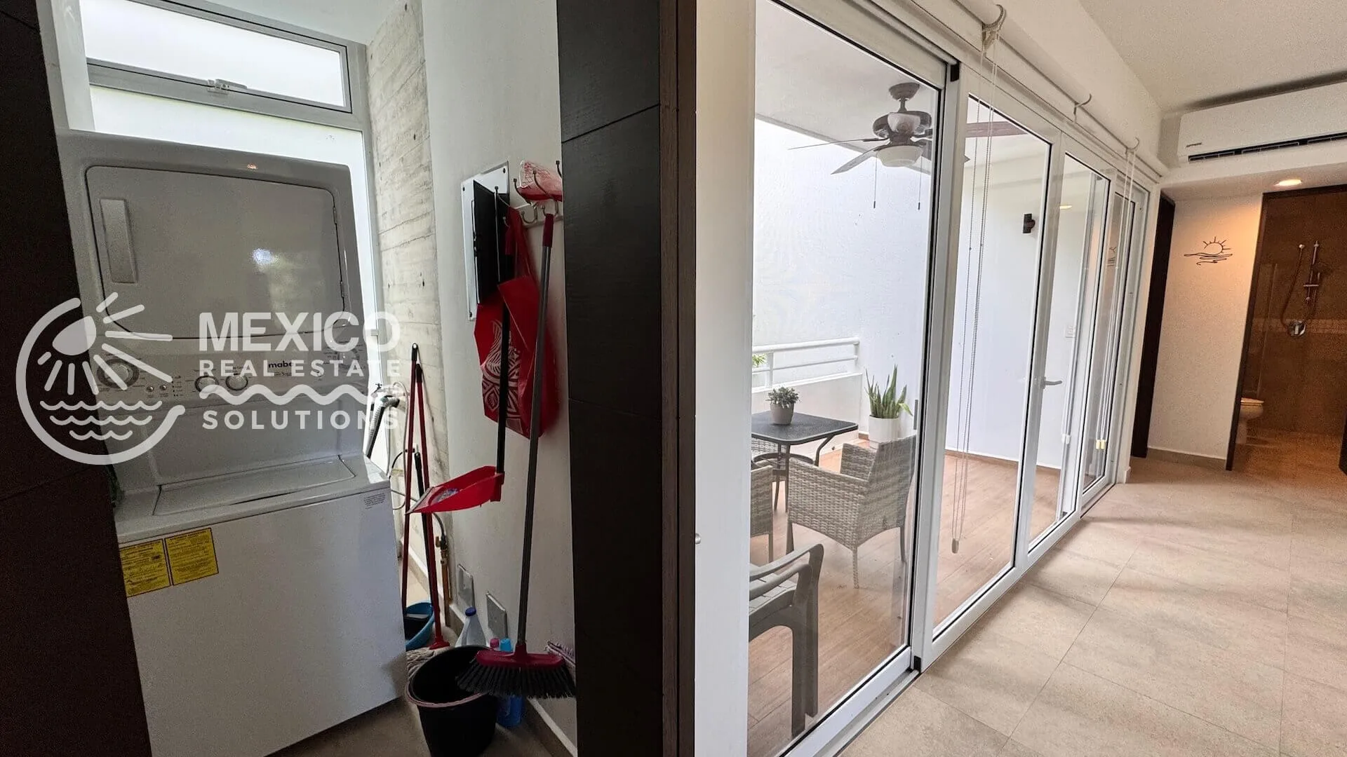 The second-floor mezzanine unit features a private terrace, tasteful neutral decor, 2 bedrooms, and 2 bathrooms. It offers 758 square feet of interior space and a 140 square foot outdoor terrace. The open-plan kitchen includes granite countertops, and the unit is equipped with in-suite laundry and air conditioning.