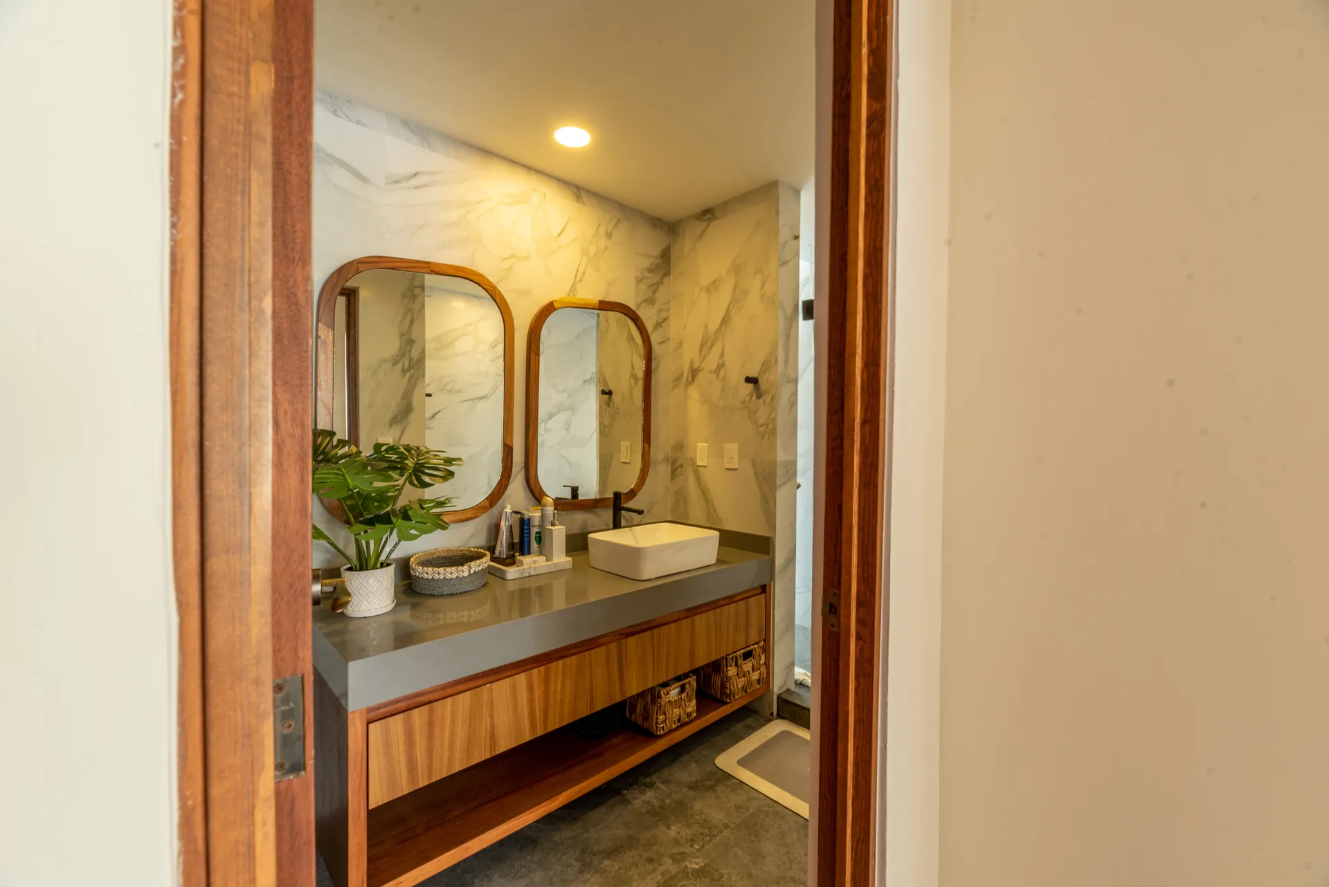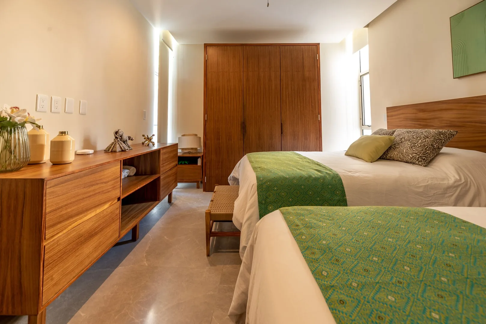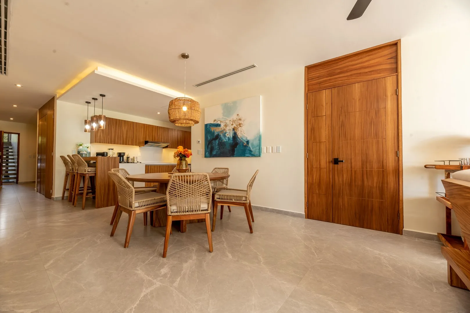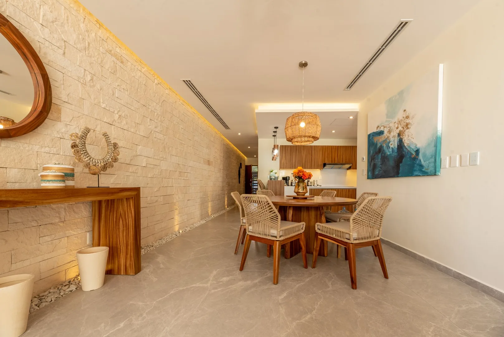 This stunning 3-bedroom, 3-bathroom apartment is a 170 square meter (1, 829 square foot) residence located in the exclusive Akumal Bay on the Mexican Caribbean. Its open-plan design features luxurious finishes in marble, Maya stone, and tzalam wood, creating an elegant and modern atmosphere.