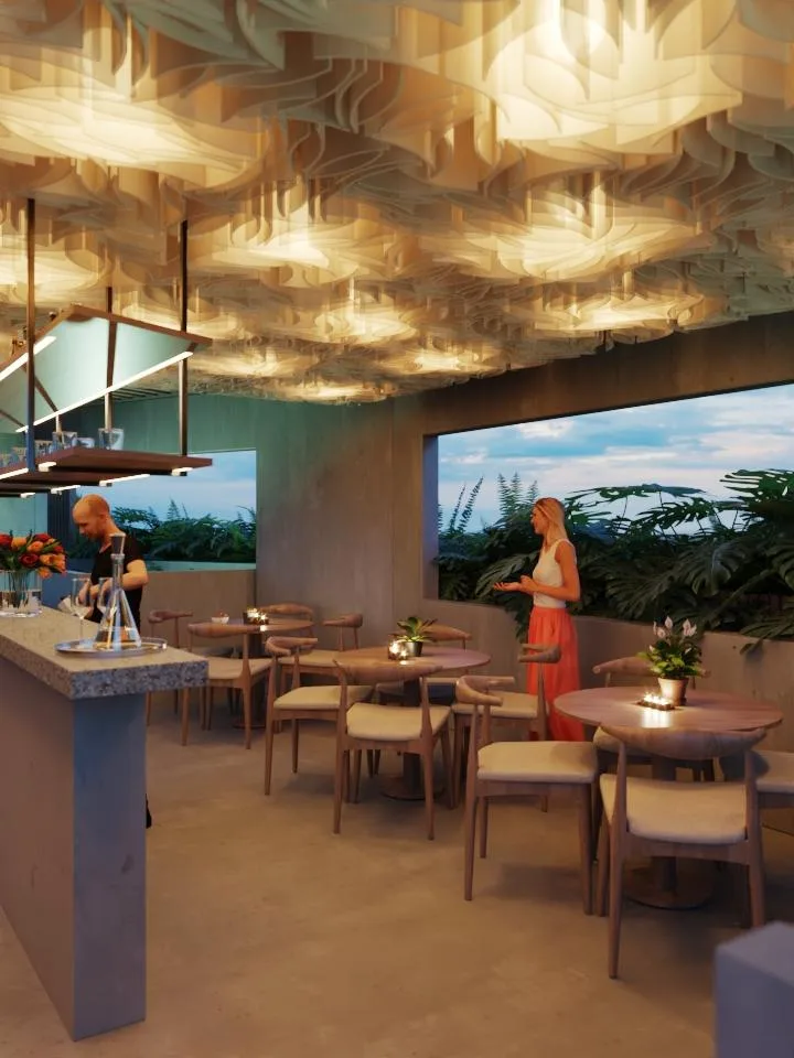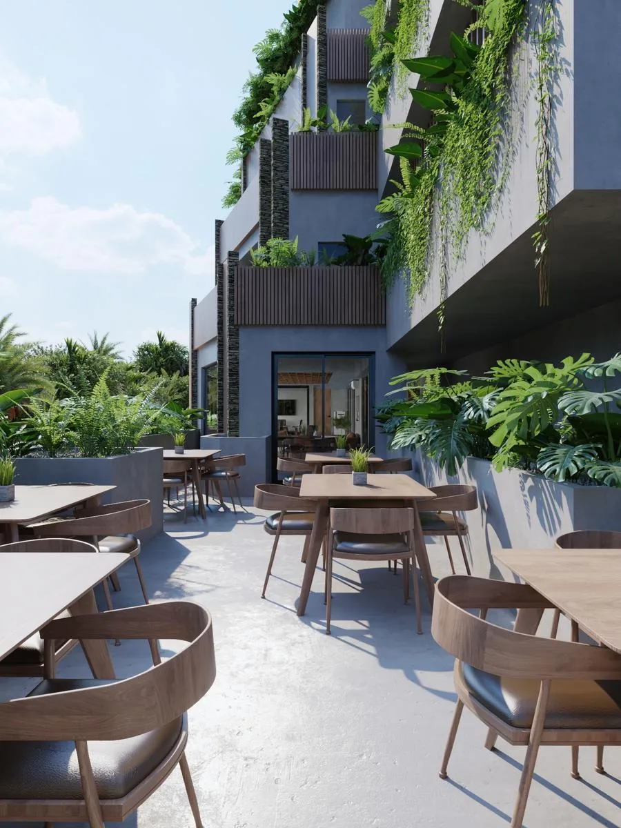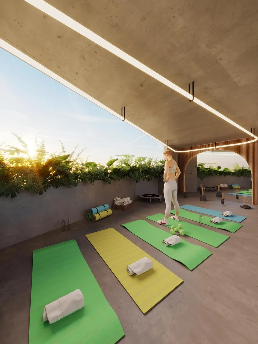 The residence provides a spa for relaxation, a fully equipped gym, and a coworking space for productivity. Year-round enjoyment is available at the swimming pool and pool bar. Additional features include a dedicated yoga area, an on-site restaurant, and a rooftop offering impressive views.