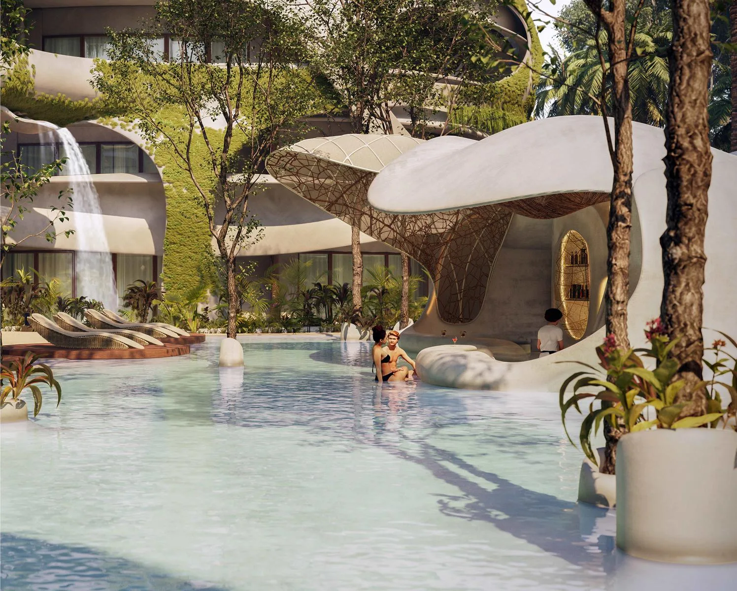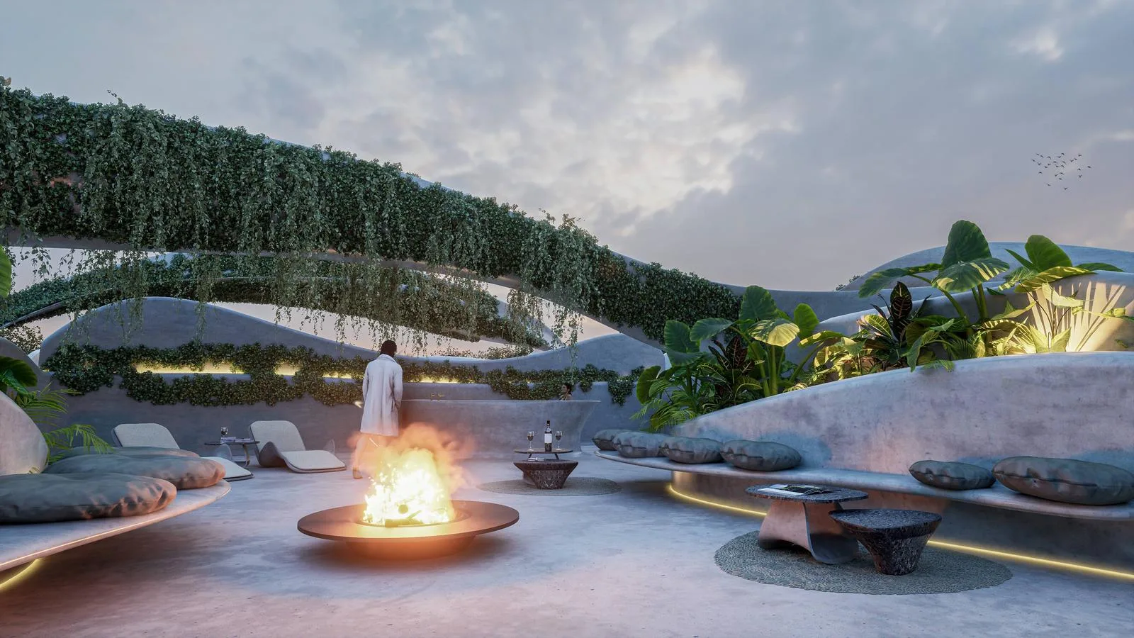 Amenities include pools, waterfalls, water features, private parking, landscaping with local vegetation, a restaurant, a jungle gym and yoga shala, and a fire pit.