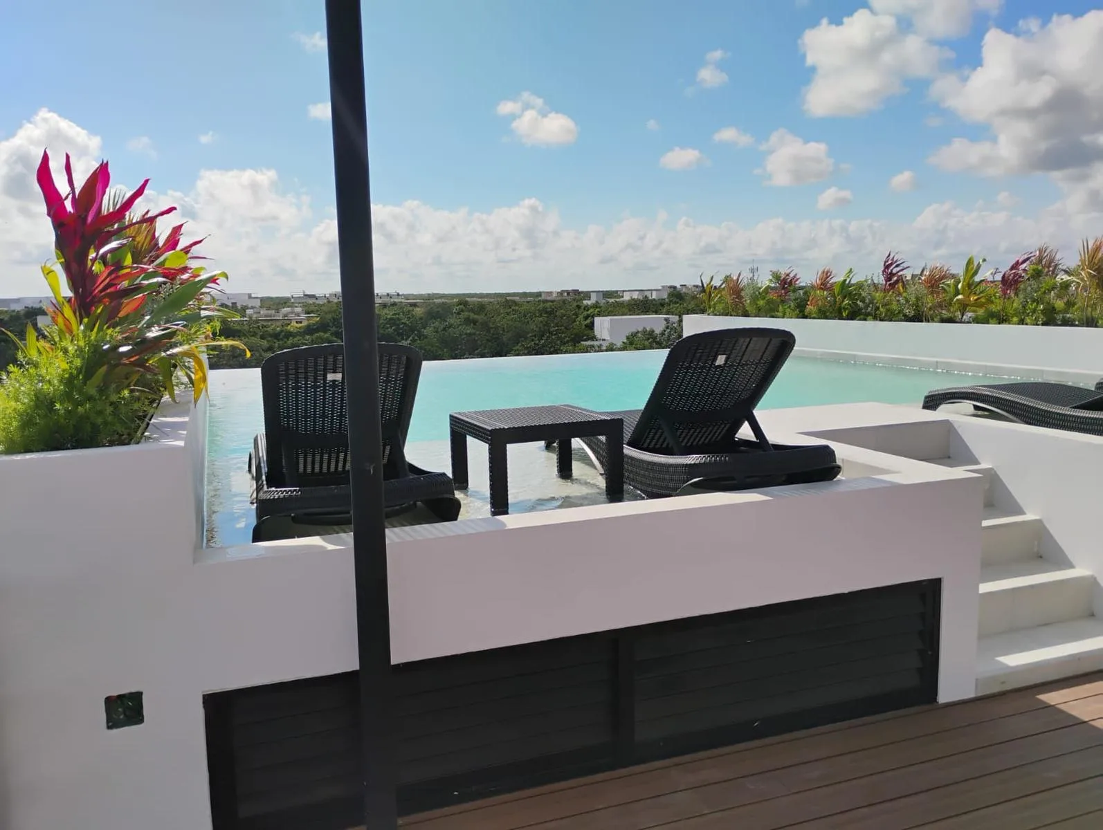 The building environment offers amenities such as a rooftop area, a swimming pool, a sunbathing area, a fully equipped gym, a spa, a coworking space, a sports bar, green areas, and controlled access. The property is situated within the strategic location of the Riviera Maya.