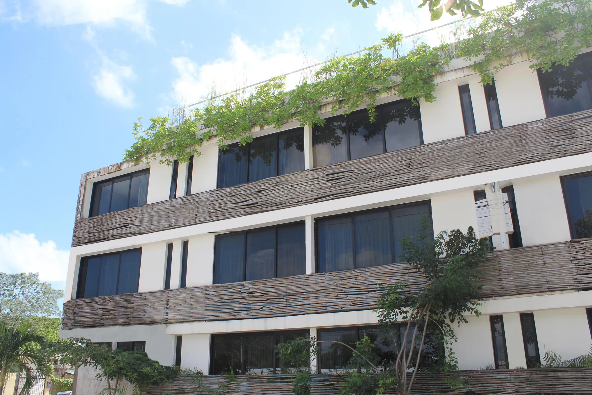 The development provides a rooftop infinity pool with views of the jungle. The rooftop terrace features sun loungers and a lounge area. There is a social space with a bar and grill area. The common areas are designed as relaxing and natural environments with Wi-Fi connectivity. The property emphasizes security and privacy.