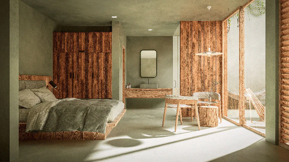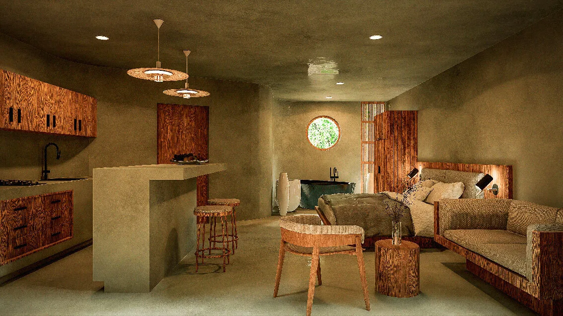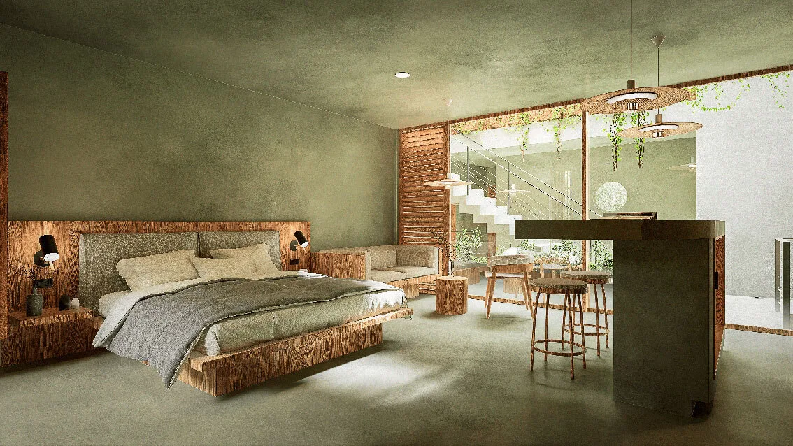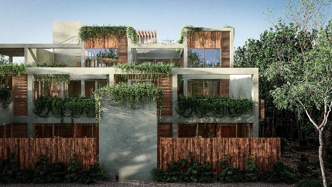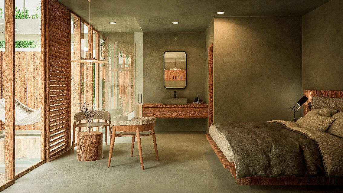 The development comprises only 14 residences, ensuring privacy and a close-knit community atmosphere. The architectural concept utilizes natural materials and warm textures within a timeless design, creating cozy spaces inspired by Tulum's local character.