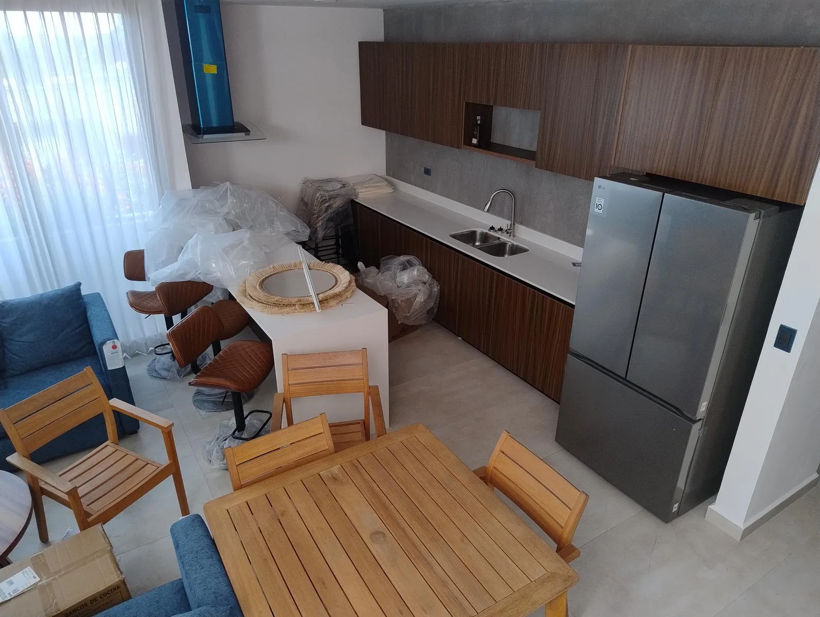 The apartment is equipped with an electric grill, oven, electric water heater, air conditioners, closets, doors, and faucetry. Mattresses, appliances, and a laundry center are not included. Services include potable water supplied by CAPA, along with an electric stove and an electric heater.