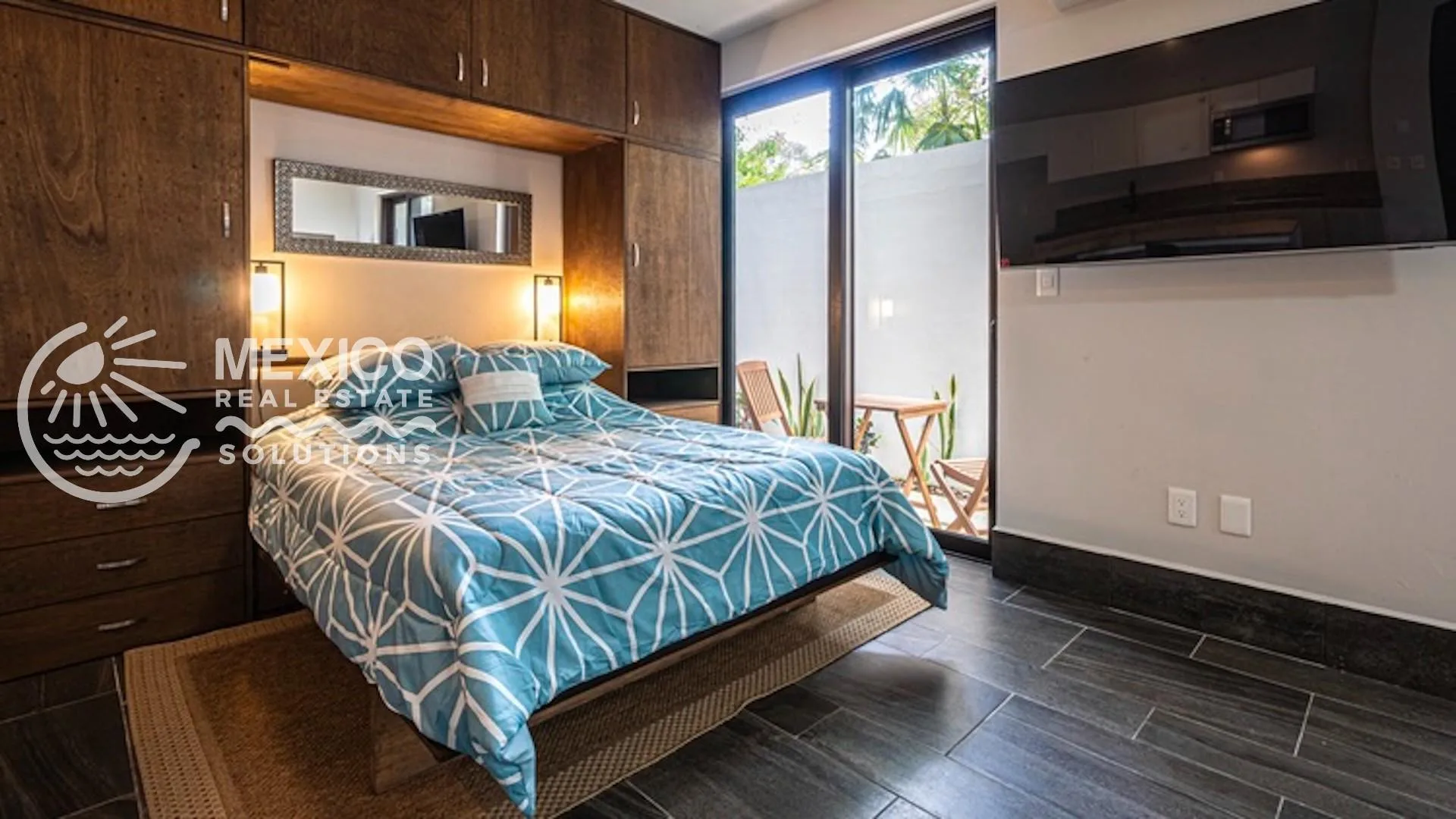 This fully furnished, ground-floor studio features a private garden terrace and is located in the quiet Zama Oasis section of Aldea Zama.
