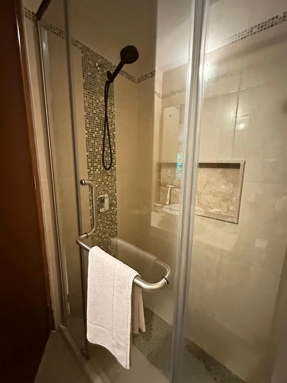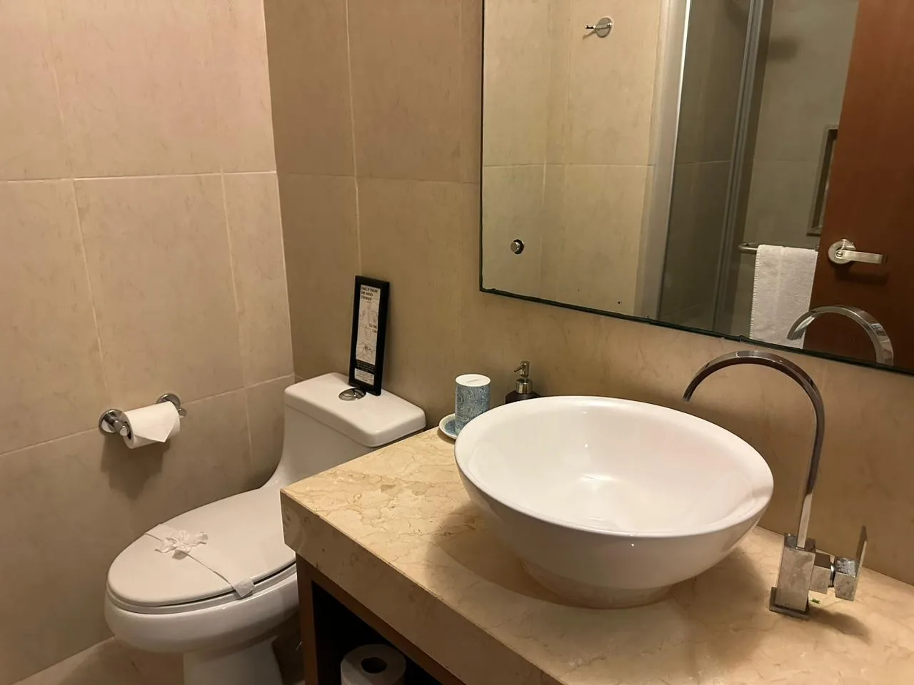 The residence is delivered turnkey with custom designer furniture. The chef-style kitchen is equipped with stainless steel appliances and includes a full-size breakfast counter seating five. An in-unit washer and dryer are provided. The space is filled with natural light throughout the day.