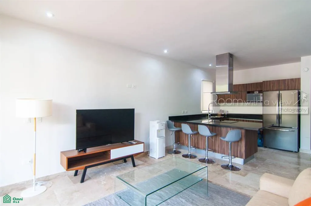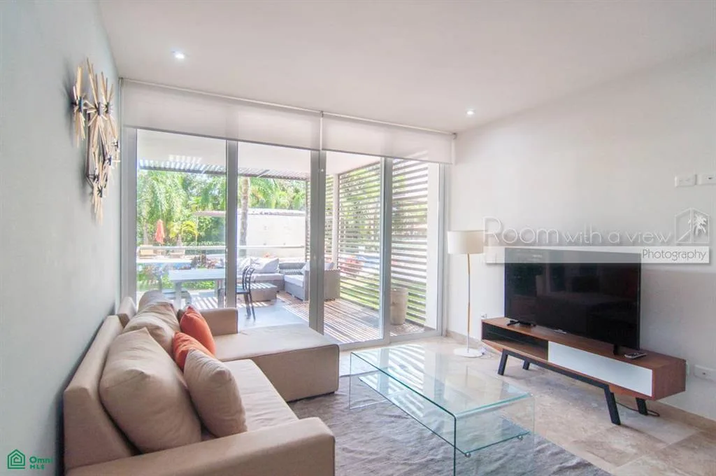 This garden level condominium offers inviting indoor-outdoor spaces within a resort community. It is situated in the Terrazas area of Akumal, nested within the expansive Grand Bahia Principe residential golf resort. The location is in the heart of the Riviera Maya, approximately halfway between Playa del Carmen and Tulum.