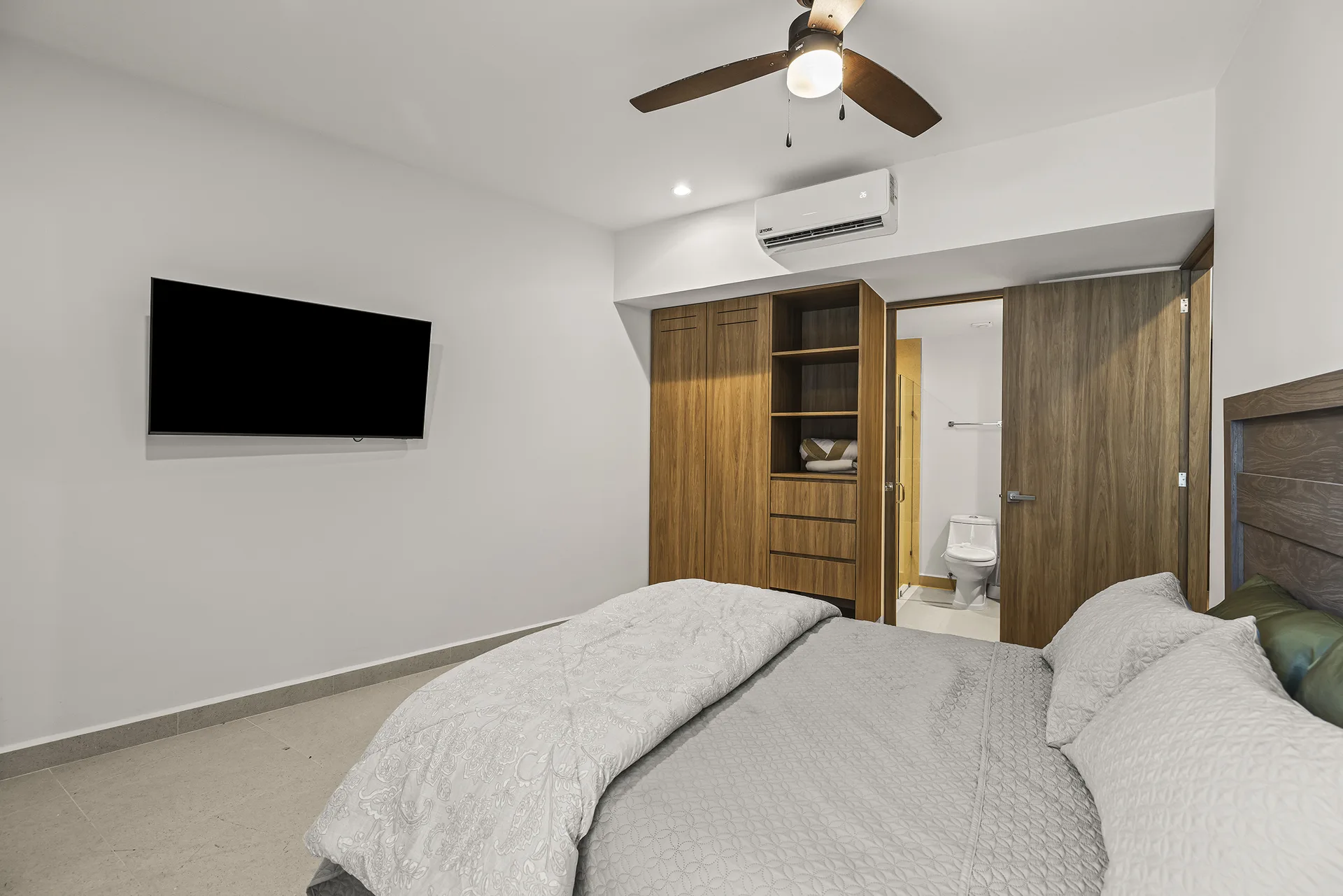 The two bedrooms with en-suite baths and built-ins are located on opposite sides of the condo, providing privacy. The property is fully furnished.