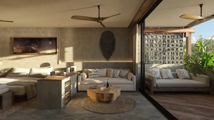 The two-bedroom unit includes two spacious bedrooms with en-suite bathrooms, an open-concept living and dining area, a fully equipped gourmet kitchen, and large terraces that integrate indoor and outdoor space. Finishes utilize natural materials such as stone, wood, and chukum.