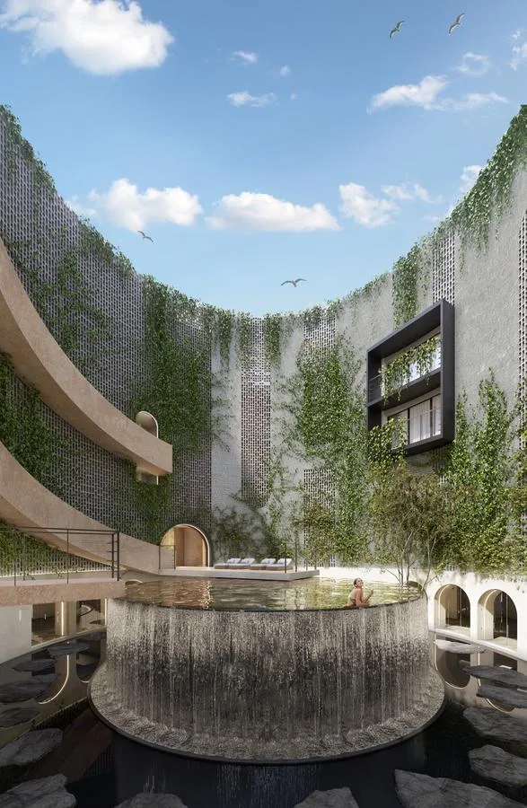A reflective pool or fountain is present, along with a bar that offers food and wine pairing dining, a cellar, and a kitchen. Wellness facilities consist of a massage area, yoga and meditation space, a temazcal, and an ice bath.