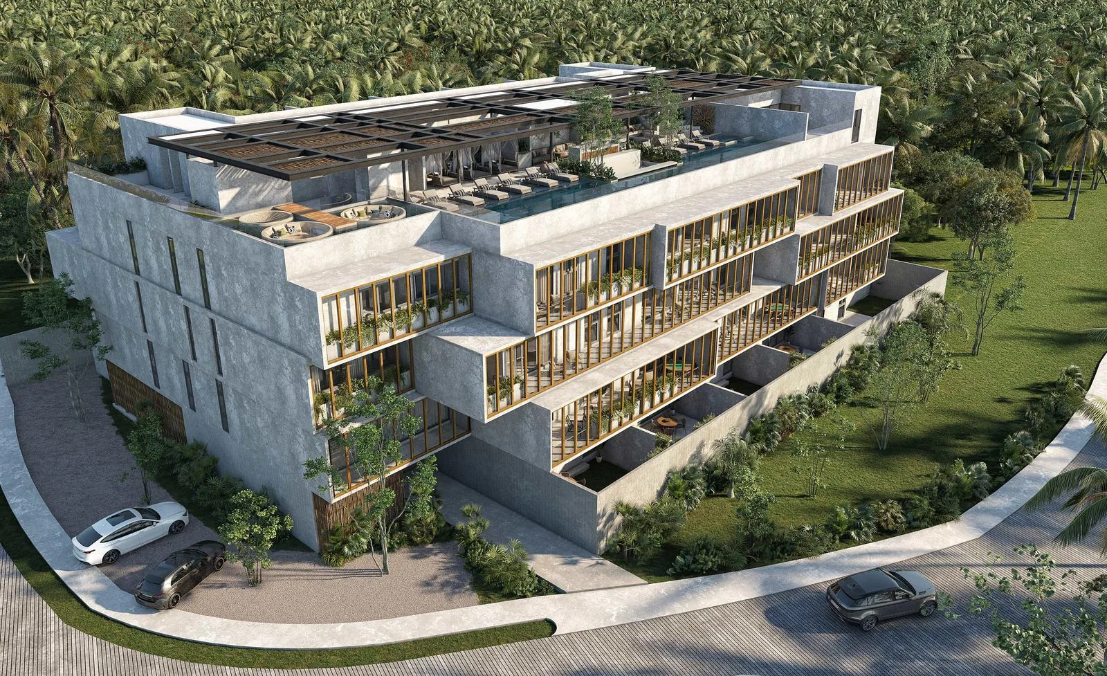 The architectural composition of the complex arises from a reinterpretation of the pre-Hispanic Mayan construction method, which utilizes a base with platforms on subsequent levels. This residential development consists of 51 apartments surrounded by nature.